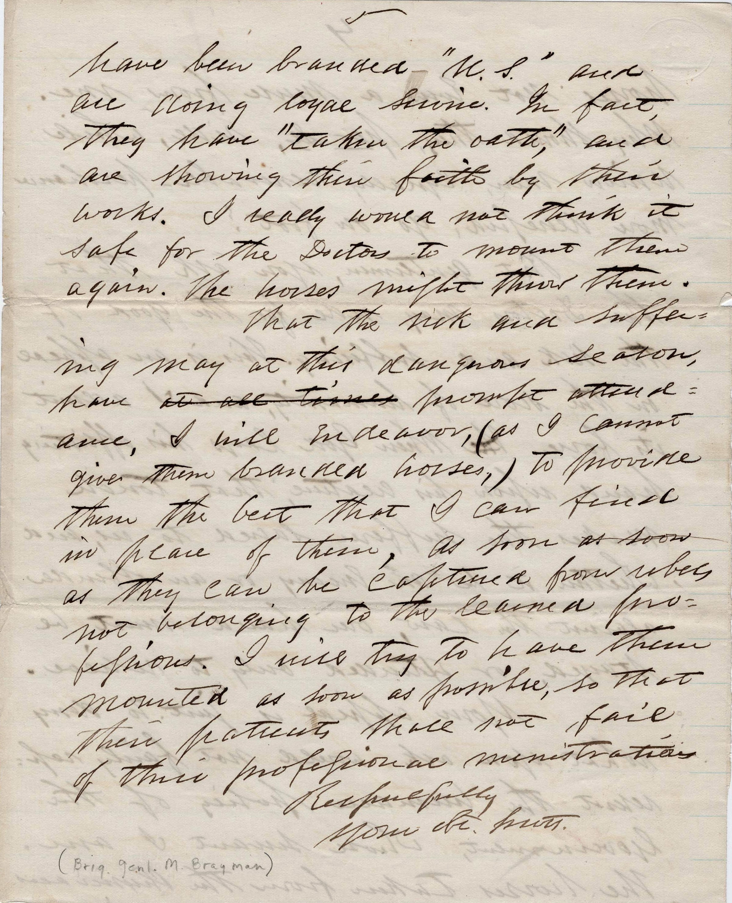 That the sick and suffering may at this dangerous section have prompt attendance, I will endeavor (as I cannot give them branded horses) to provide them the best that I can find in place of them as soon as they can be captured from rebels not belonging to the learned professions. I will try to have them mounted as soon as possible so that their patients shall not fail of their professional ministrations. Respectfully, your obedient servant.
