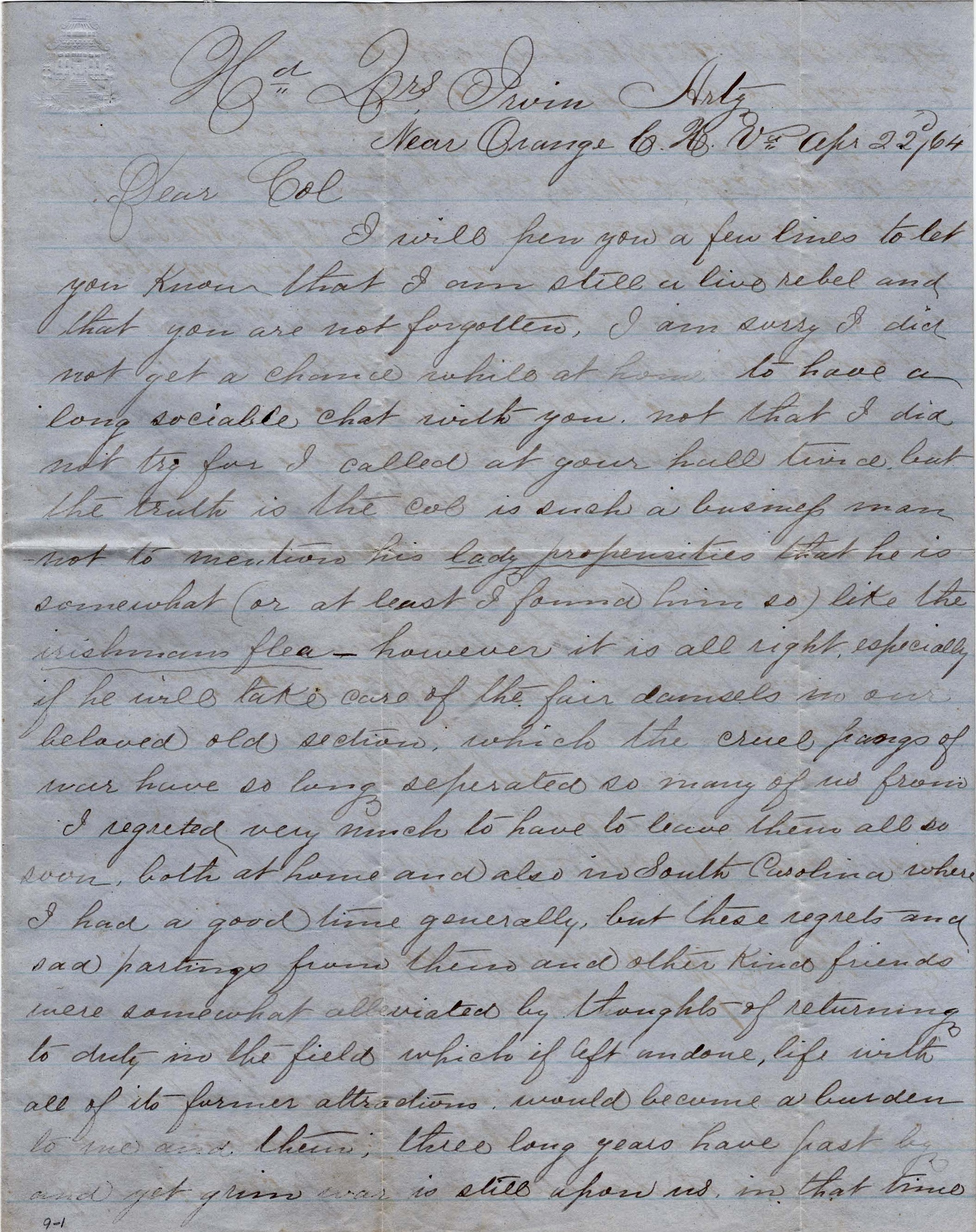 I will pen you a few lines to let you know that I am still a live rebel and that you are not forgotten. I am sorry I did not get a chance while at home to have a long sociable chat with you—not that I did not try for I called at your hall twice, but the truth is the Colonel is such a business man not to mention his lady propensities that he is somewhat (or at least I found him so) like the irishman’s flea. However, it is all right, especially if he will take care of the fair damsels in our beloved old section which the cruel fangs of war have so long separated so many of us from. I regretted very much to have to leave them all so soon, both at home and also in South Carolina where I had a good time generally, but these regrets and sad partings from them and other kind friends were somewhat alleviated by thoughts of returning to duty in the field which if left undone, life with all of its former attractions would become a burden to me and them.
