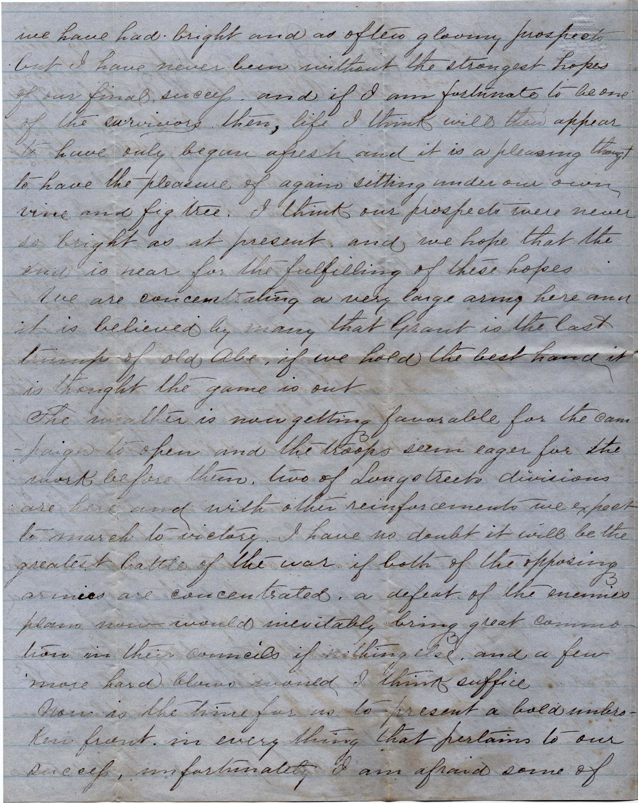 We are concentrating a very large army here and it is believed by many that Grant is the last trump of Old Abe. If we hold the best hand, it is thought the game is out.
