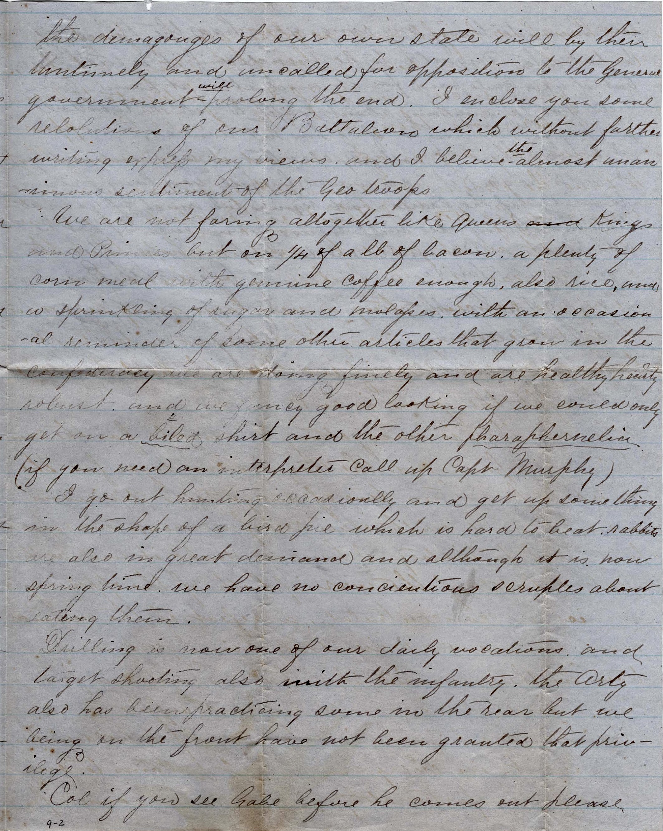 We are not faring altogether like Queens and Kings and Princes but on 1/4 of a pound of bacon, a plenty of corn meal with genuine coffee enough, also rice, and a sprinkling of sugar and molasses, with an occasional reminder of some other articles that grow in the Confederacy. We are doing finely and are healthy, hearty, robust, and we fancy good looking—if we could only get on a boiled shirt and the other paraphernalia (if you need an interpreter, call up Capt. Murphy).