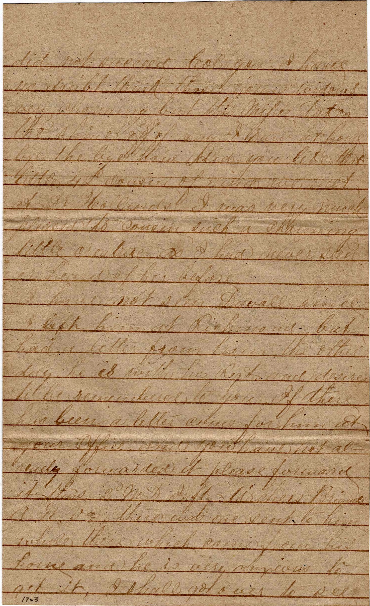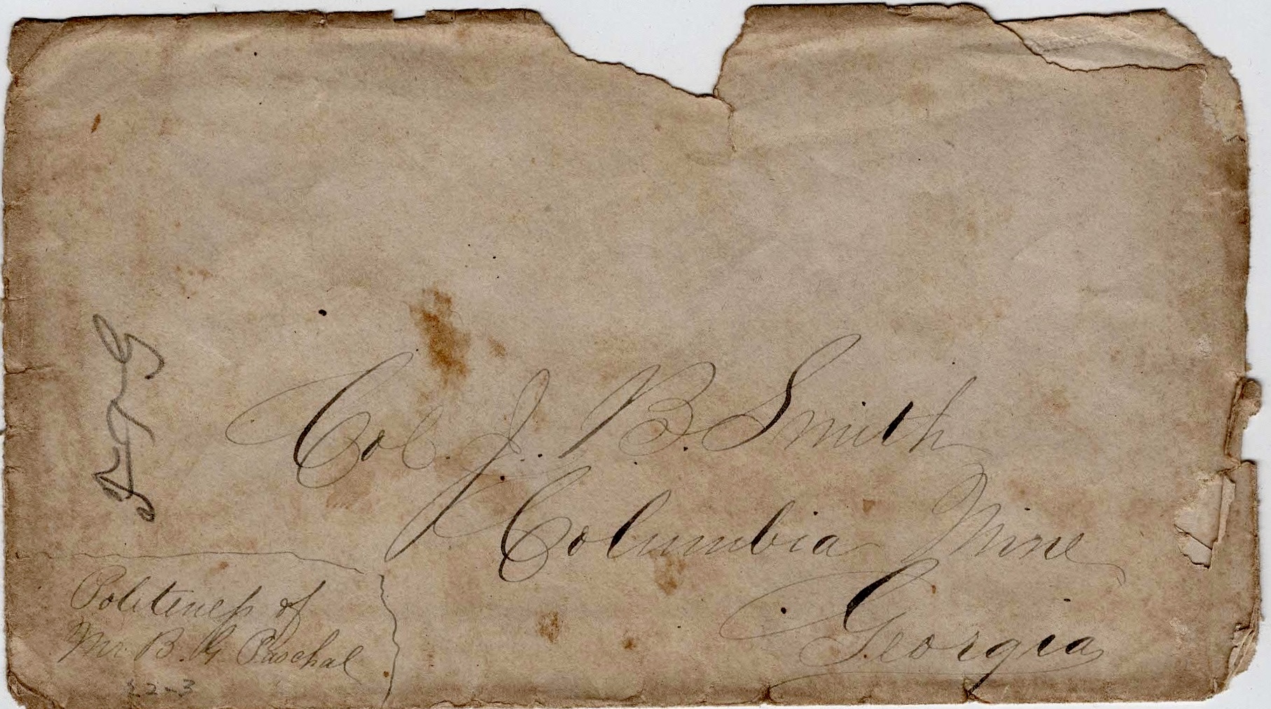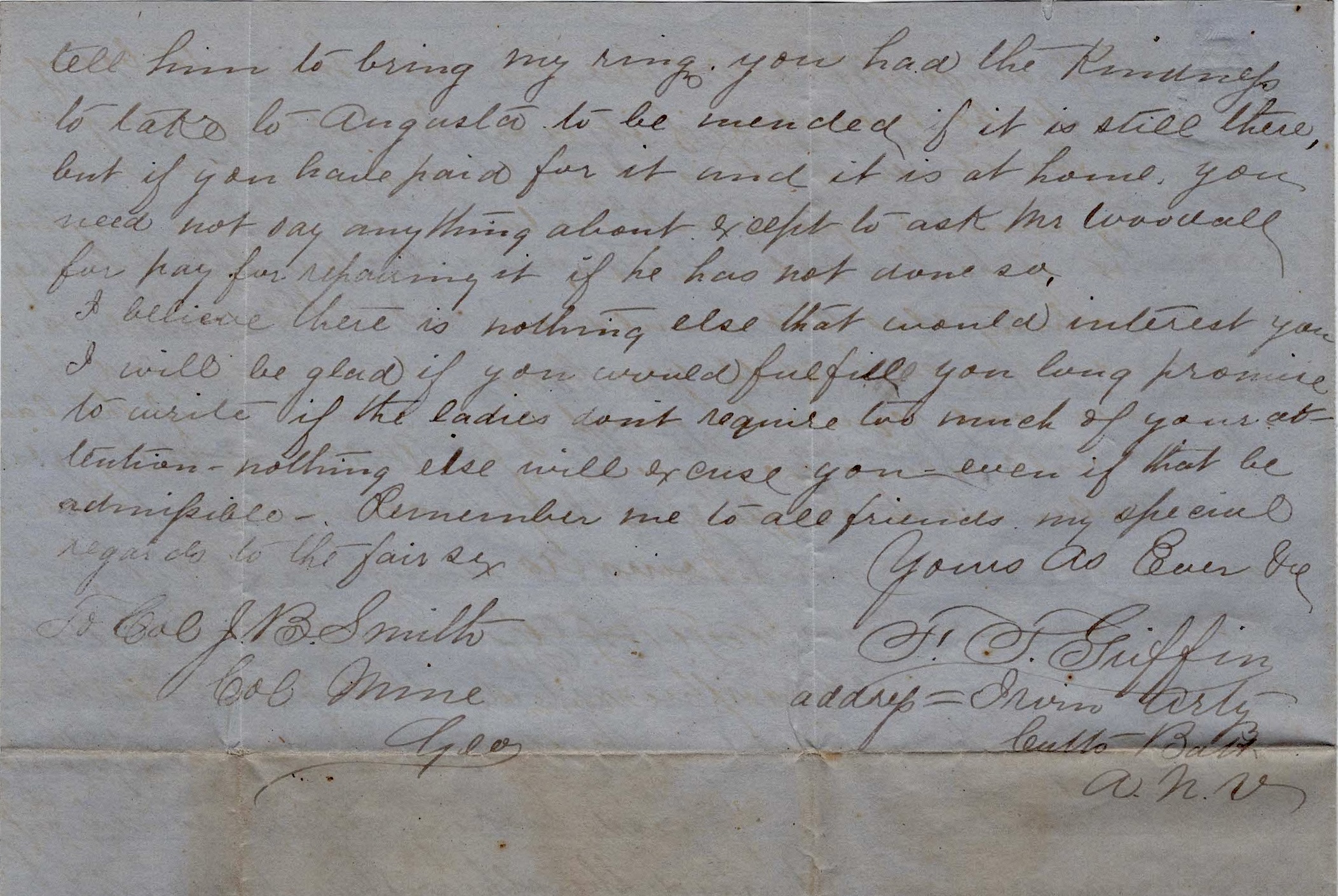 Colonel, if you see Gabe before he comes out, please tell him to bring my ring you had the kindness t take to Augusta to be mended, if it is still there. But if you have paid for it and it is at home, you need not say anything about [it] except to ask Mr. Woodall for pay for repairing it if he has not done so.