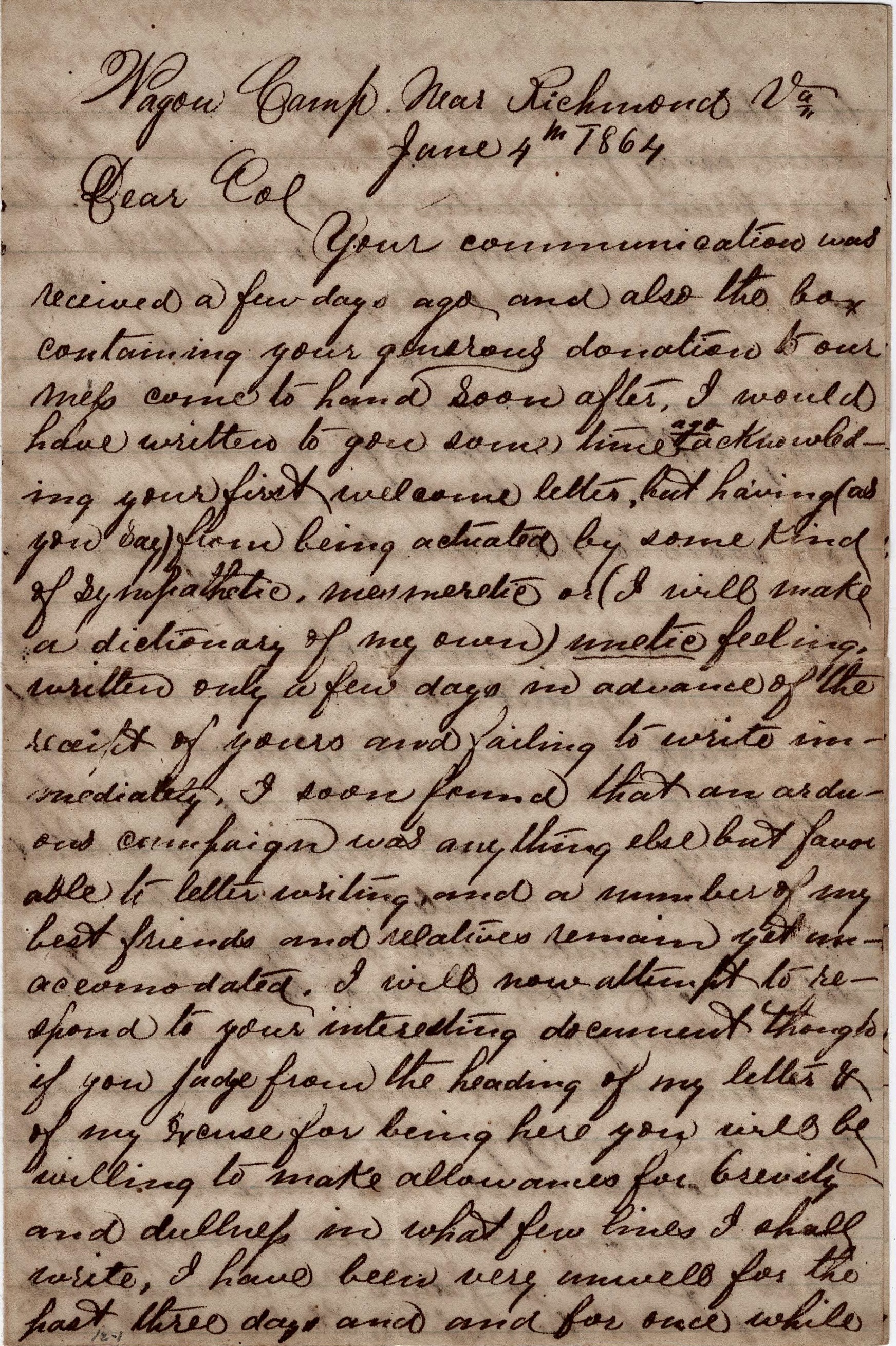 Your communication was received a few days ago and also the box containing your generous donation to our mess come to hand soon after. I would have written to you some time ago acknowledging your first welcome letter, but having (as you say) from being actuated by some kind of sympathetic, mesmeretic or (I will make a dictionary of my own) unetic feeling, written only a few days in advance of the receipt of yours and failing to write immediately I soon found that an arduous campaign [and] was anything else but favorable to letter writing, and a number of my best friends and relatives remain yet unaccommodated.