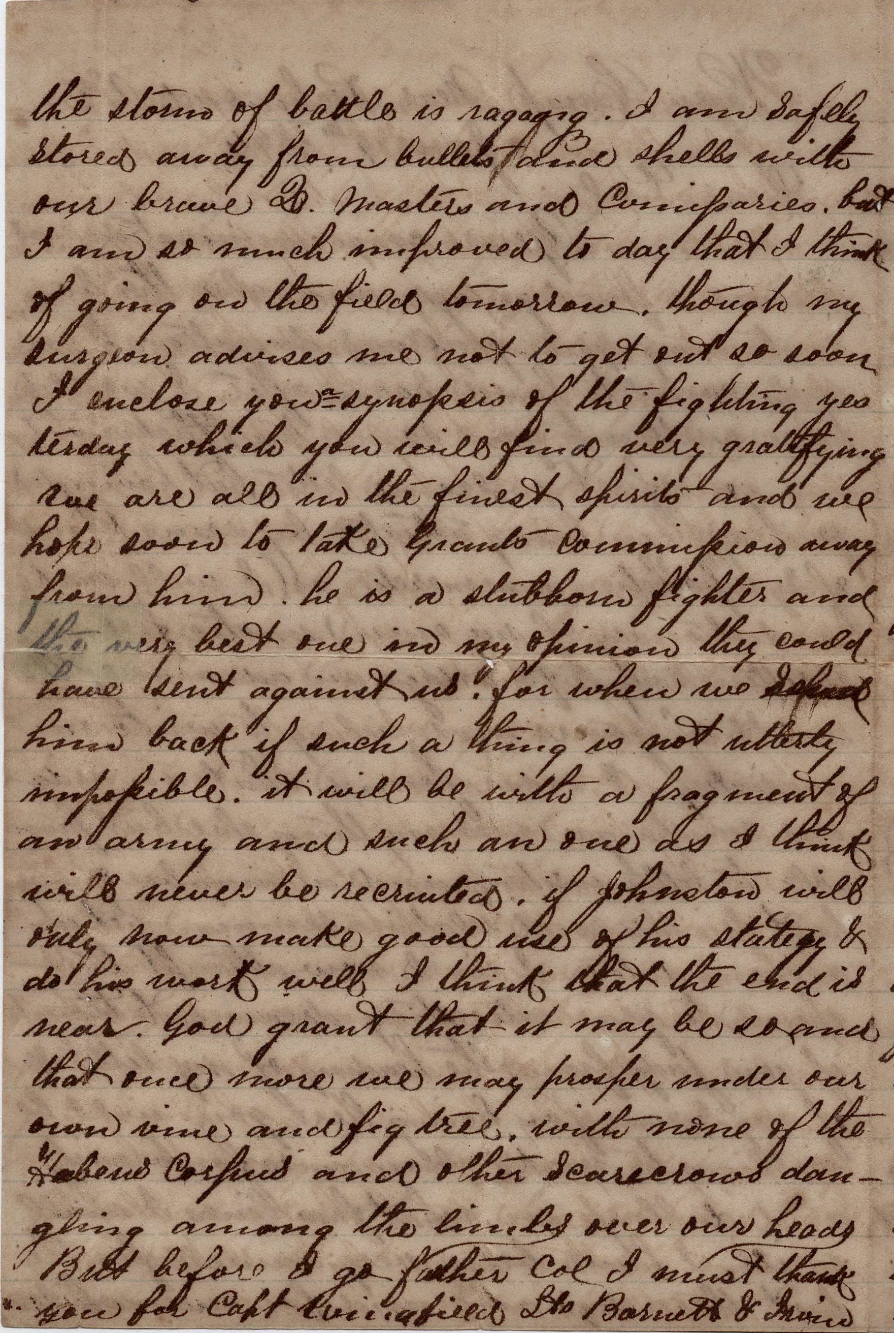 I enclose you a synopsis of the fighting yesterday which you will find very gratifying. We are all in the finest spirits and we hope soon to take Grant’s commission away from him. He is a stubborn fighter and the very best one in my opinion they could have sent against us for when we send him back—if such a thing is not utterly impossible—it will be with a fragment of an army and such an one as I think will never be recruited. If Johnston will only now make good use of his strategy & do his work well, I think that the end is near. God grant that it may be so and that once more we may prosper under our own vine and fig tree with none of the Habeas Corpus and other Scarecrows dangling among the limbs over our heads.
