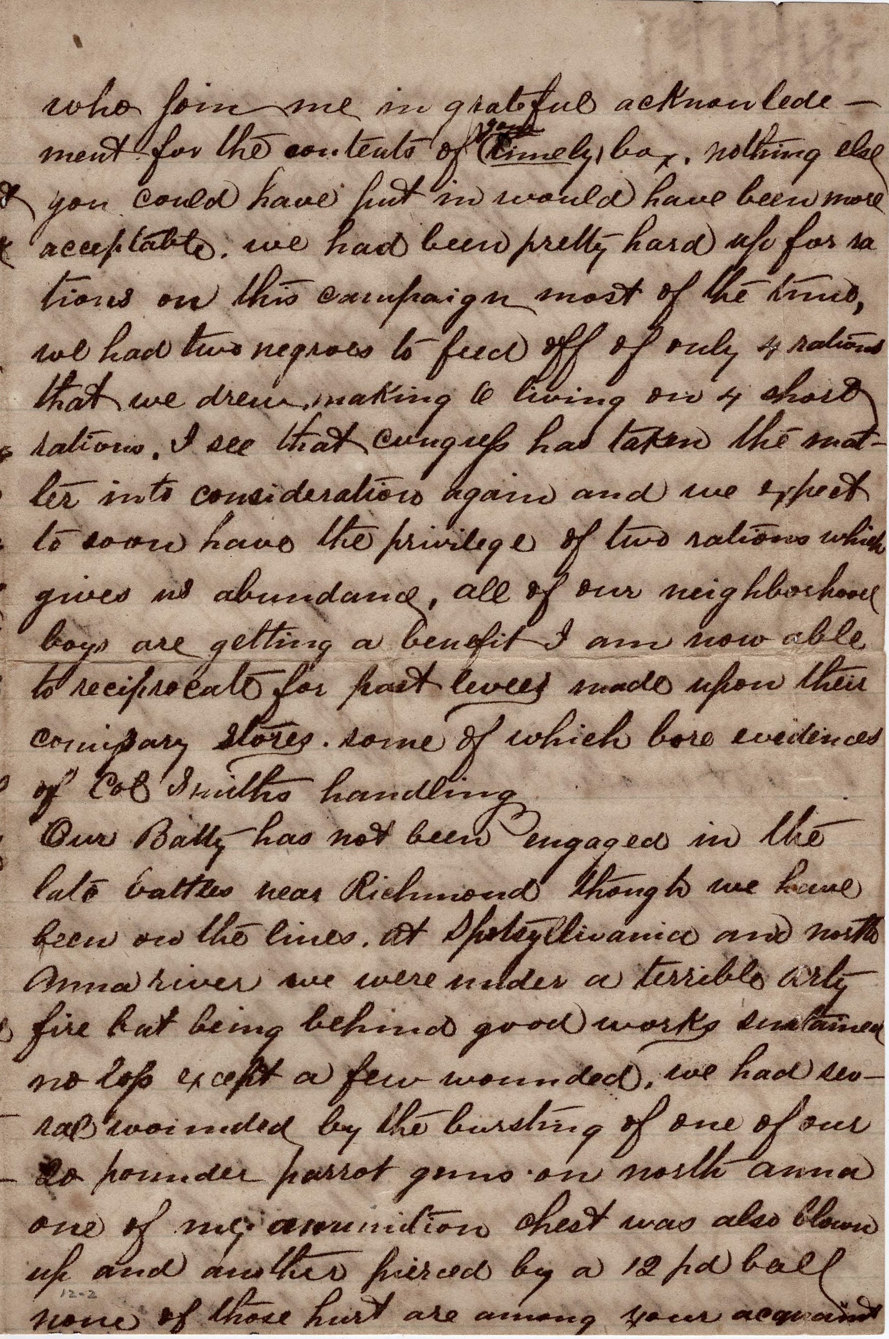 But before I go farther, Colonel, I must thank you for Capt. Wingfield, Lts. Barnett and Irvin who join me in grateful acknowledgement for the contents of your timely box. Nothing else you could have put in would have been more acceptable. We had been pretty hard up for rations on this campaign most of the time. We had two negroes to feed off of only 4 rations that we drew, making 6 living on four short rations.