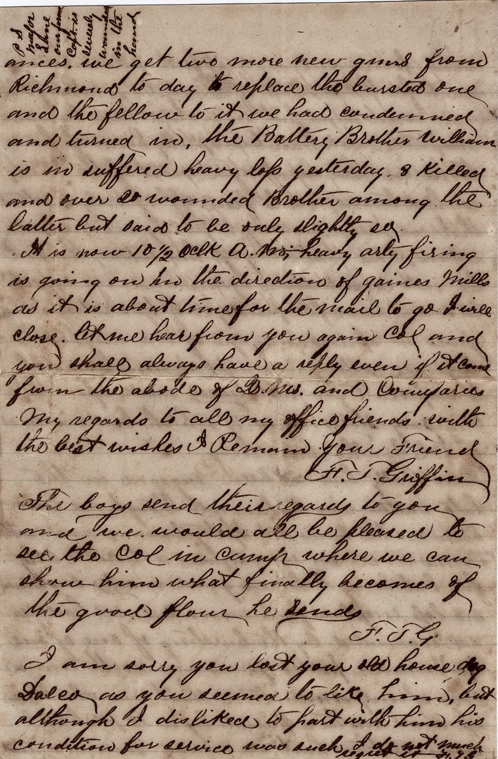 It is now 10.30 o’clock a.m.; heavy artillery firing is going on in the direction of Gaines Mills. As it is about time for the mail to go, I will close. Let me hear from you again, Colonel, and you shall always have a reply even if it comes from the abode of quartermasters and commissaries. My regards to all my office friends. With the best wishes, I remain your friend, — F. T. Griffin
