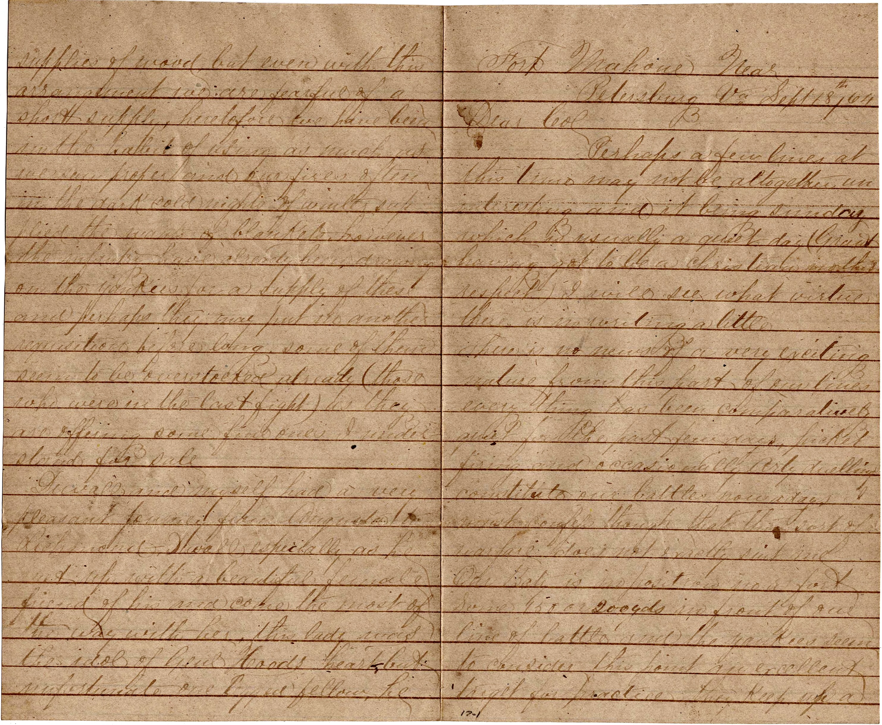 1 Ferdinand C. Duvall (1835-1878) of Ann Arundel county, Maryland, served as the Captain of Co. C, 2nd Maryland Infantry. He was wounded seriously in the right thigh in the fighting at Peebles’ Farm on 30 September 1864 less than two weeks after this letter was written.