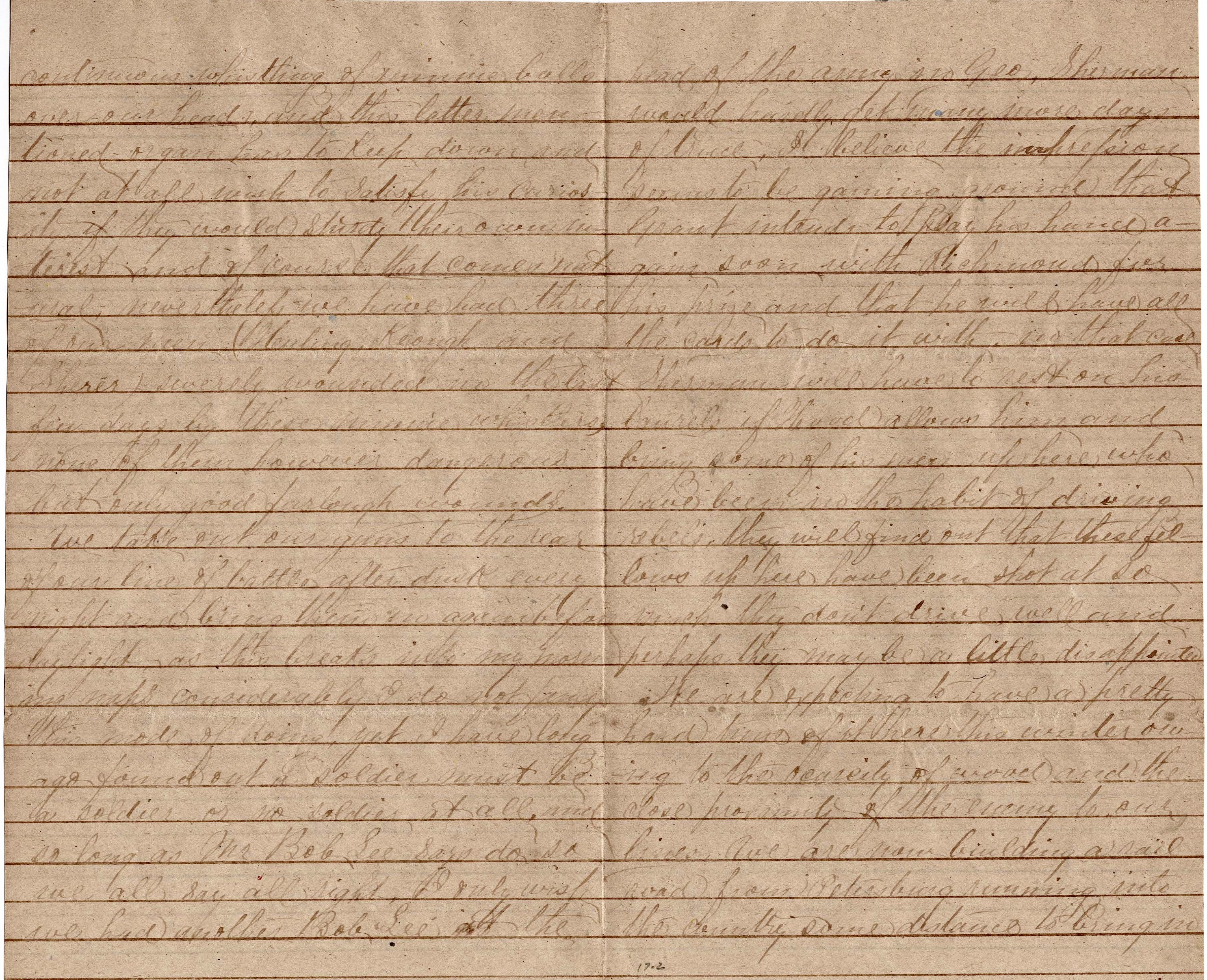 We take out our guns to the rear of our line of battle after dusk every night and bring them in again before daylight. As this breaks into my morning naps considerably, I do not find this mode of doing [enjoyable], yet I have long ago found out a soldier must be a soldier or no soldier at all. And so long as Mr. Bob Lee says do so, we all say all right. I only wish we had another Bob Lee at the head of the army in Georgia. Sherman would hardly get many more days of truce. I believe the impression seems to be gaining ground that Grant intends to play his hand again soon with Richmond, for his prize and that he will have all the cards to do it with. In that case, Sherman will have to rest on his laurels—if Hood allows him—and bring some of his men up here who have been in the habit of driving rebels. They will find out that these fellows up here have been shot at so much they don’t drive well and perhaps they may be a little disappointed.