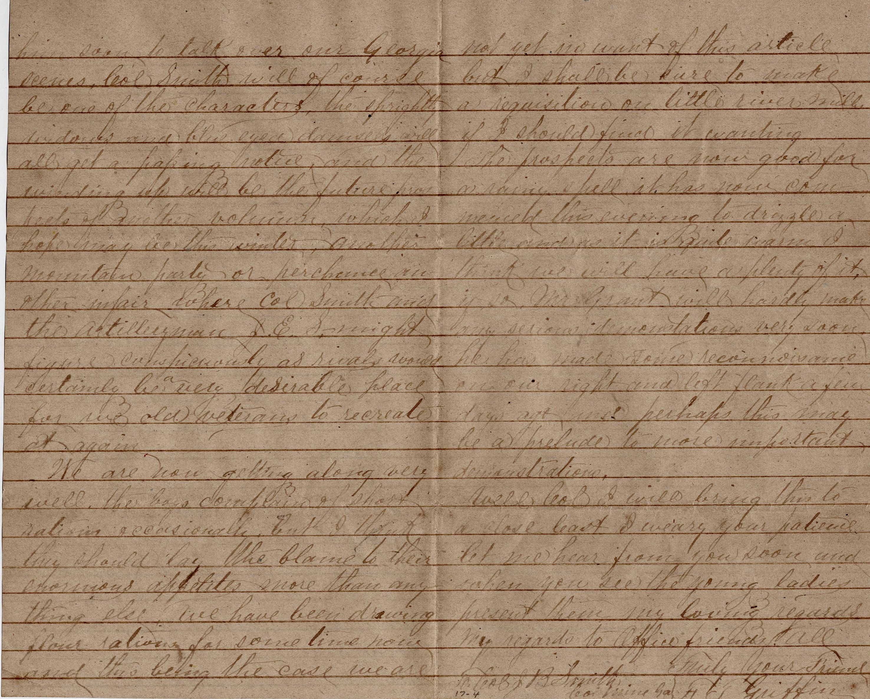 Well, Colonel, I will bring this to a close lest I weary your patience. Let me hear from you soon and when you see the young ladies, present them my loving regards. My regards to office friends. Truly your friend, — F. T. Griffin