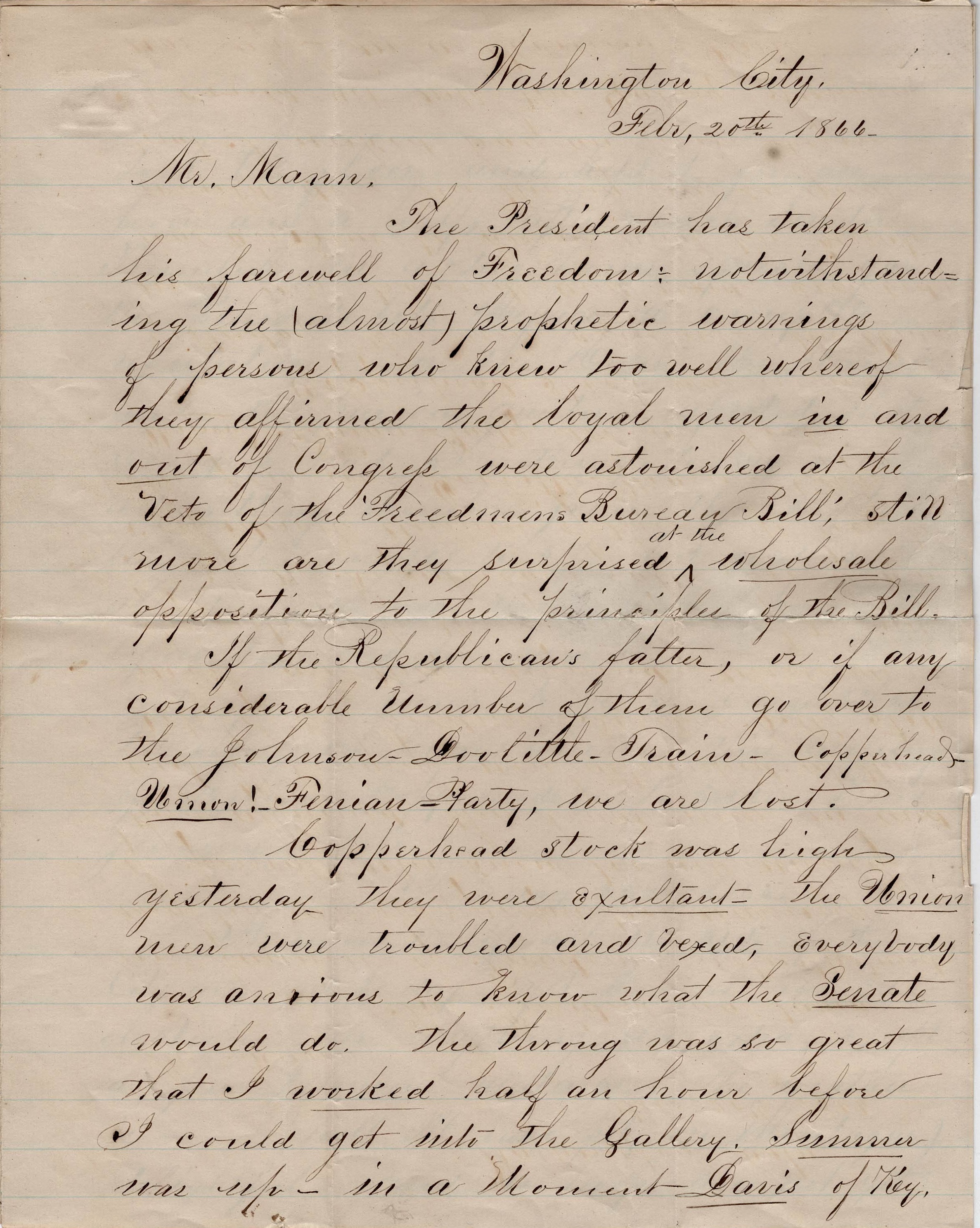 The President has taken his farewell of Freedom; notwithstanding the (almost) prophetic warnings of persons who know too well whereof they affirmed the loyal men in and out of Congress were astonished at the veto of the Freedmen’s Bureau Bill: still more are they surprised at the wholesale opposition to the principles of the Bill. If the Republican’s falter, or if any considerable number of them go over to the Johnson-Doolittle train—Copperhead—Union! Fernian Party, we are lost. 1
