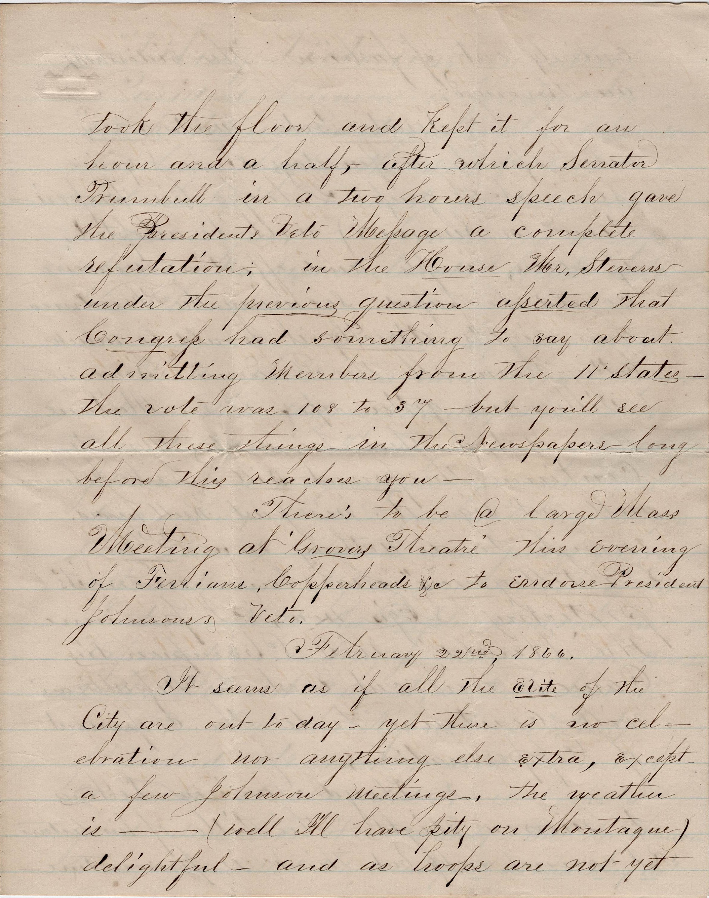 Copperhead stock was high yesterday. They were exultant. The Union men were troubled and vexed. Everybody was anxious to know what the Senate would do. The throng was so great that I worked half an hour before I could get into the Gallery. Sumner was up, in a moment Davis of Kentucky took the floor and kept it for an hour and a half, after which Senator Trumbull in a two hours speech gave the President’s Veto Message a complete refutation; in the House Mr. [Thaddeus] Stevens under the previous question asserted that Congress had something to say about admitting members from the 11 states. The vote was 108 to 37, but you’ll see all these things in the newspapers long before this reaches you.