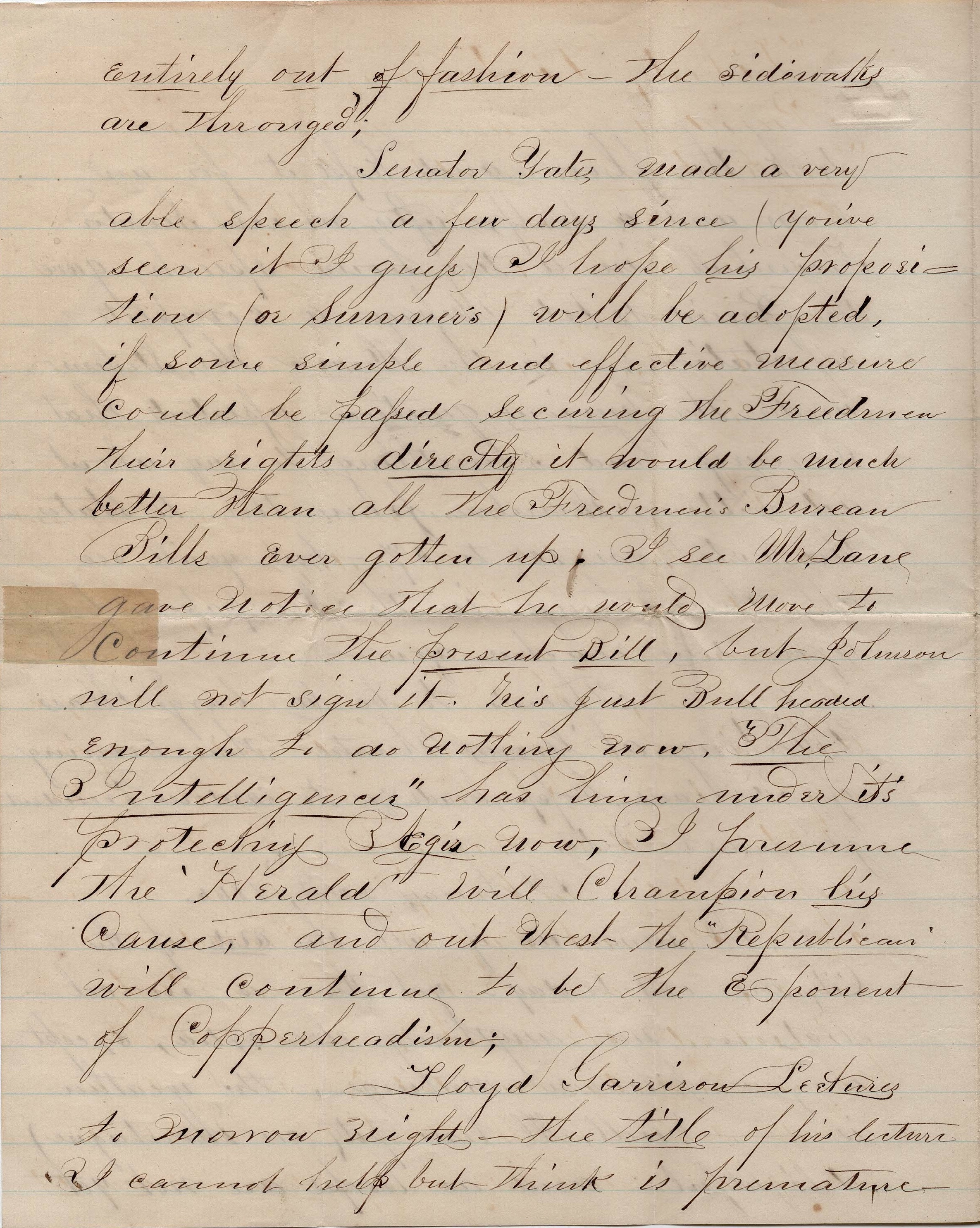 Senator Yates made a very able speech a few days since (you’ve seen it, I guess). I hope his proposition (or Sumner’s) will be adopted. If some simple and effective measure could be passed securing the Freedmen their rights directly it would be much better than all the Freedmen’s Bureau Bills ever gotten up. I see Mr. Lane gave notice that he would move to continue the present Bill, but Johnson will not sign it. He’s just bull headed enough to do nothing now. The Intelligencer has him under its protecting aegis now. I presume the Herald will champion his cause, and out west the Republican will continue to be the exponent of copperheadism.