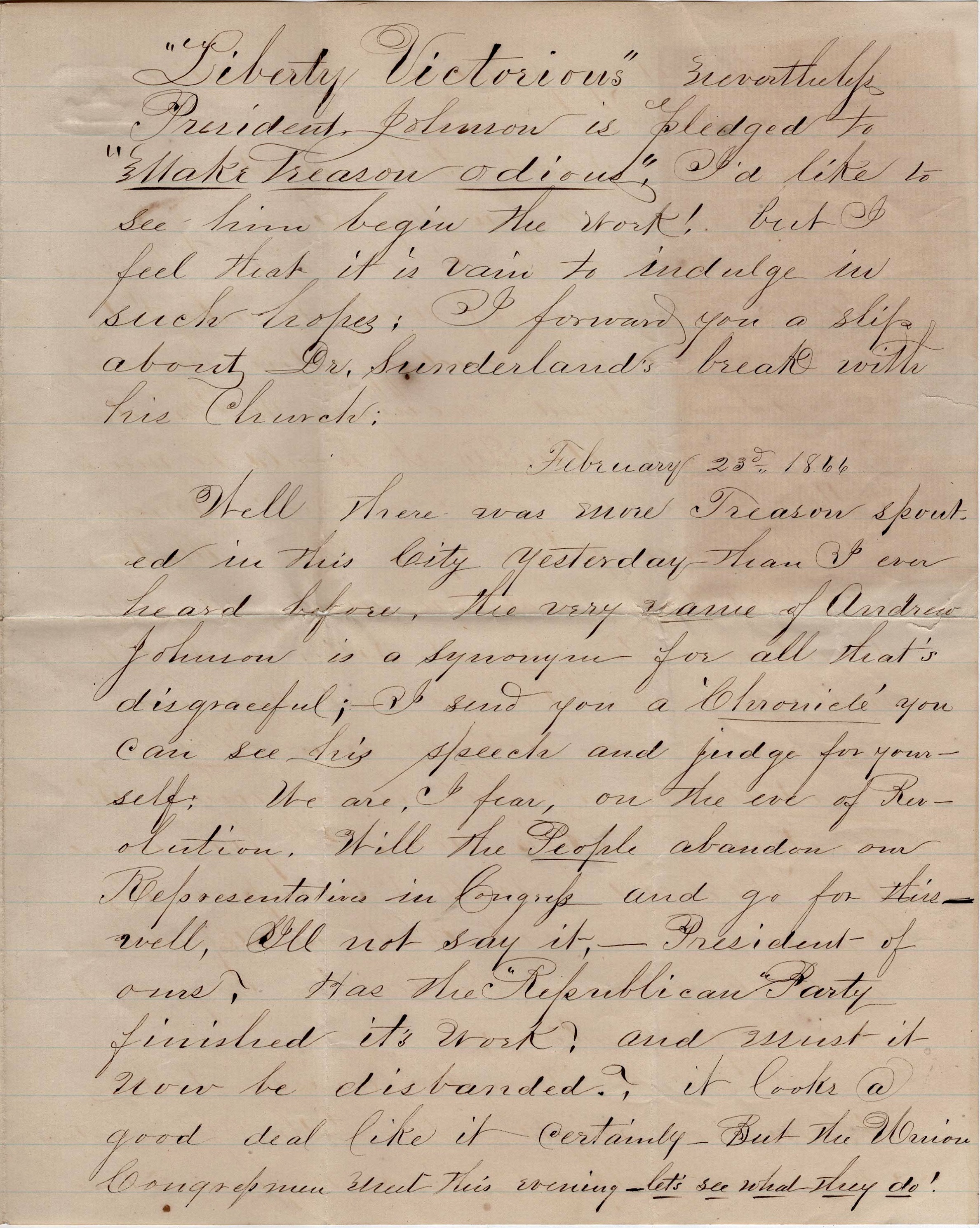 Well there was more Treason spouted in this city yesterday than I ever heard before. The very name of Andrew Johnson is a synonym for all that’s disgraceful. I send you a Chronicle you can see his speech and judge for yourself. We are, I fear, on the eve of Revolution. Will the people abandon our Representatives in Congress and go for this? Well, I’ll not say it, —– President of ours. Has the Republican Party finished its work? and must it now be disbanded? It looks a good deal like it certainly. But the Union Congressmen meet this evening. Let’s see what they do! [no signature]