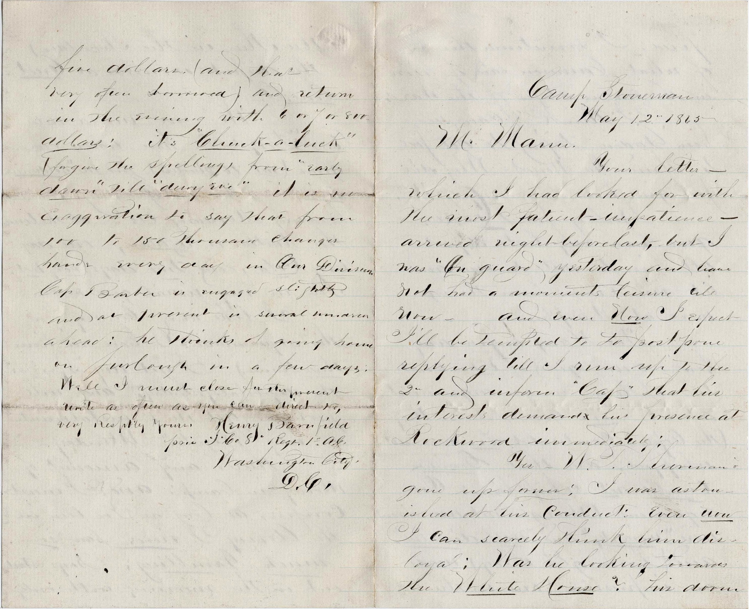 Well, I must close for the present. Write as often as you can. Direct to Henry Barnfield, private in Co. I, 8th Regt., 1st Army Corps, Washington D. C.