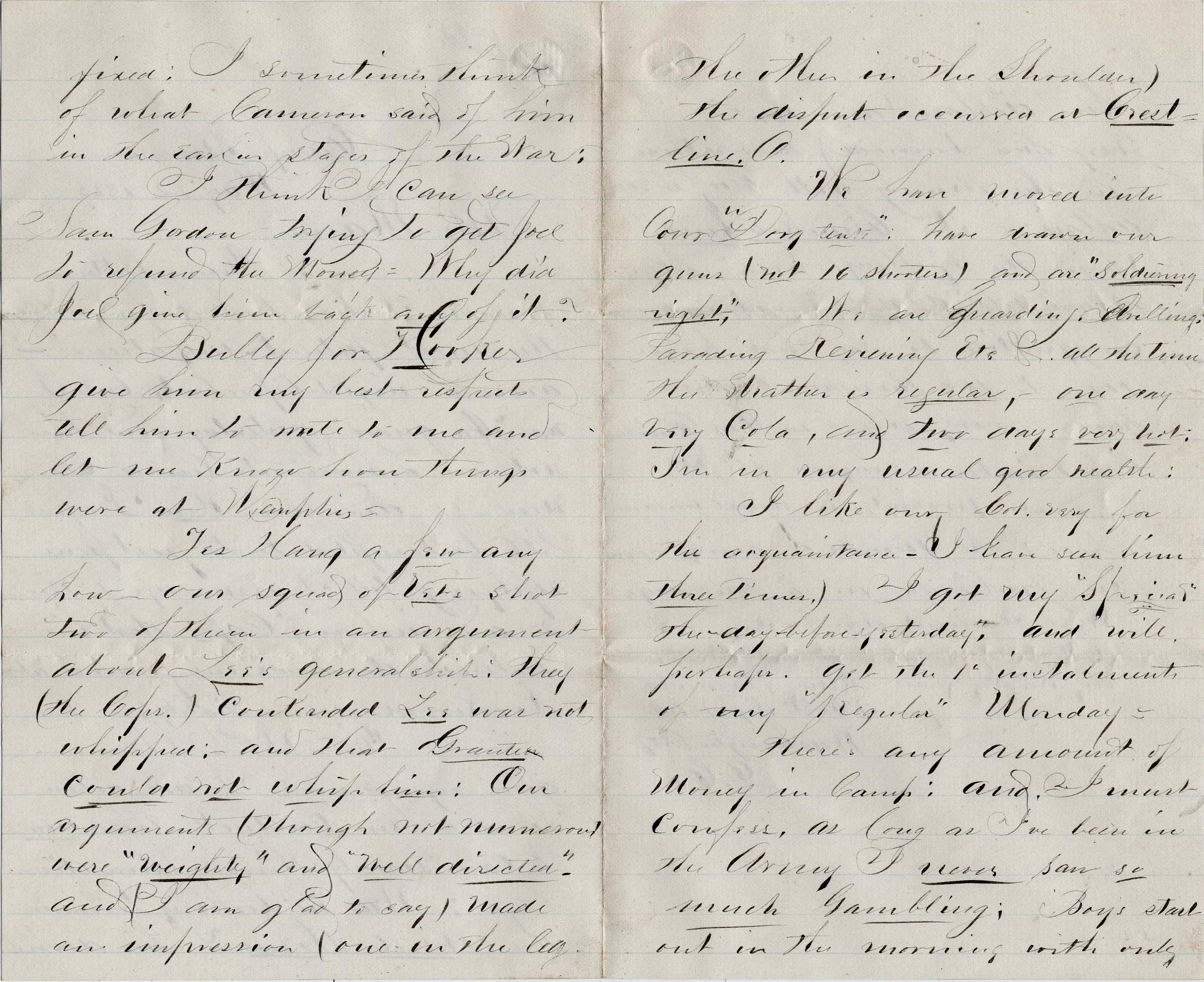 Bully for Hooker. Give him my best respects. Tell him to write to me and let me know how things were at Memphis. Let hang a few anyhow. Our squad of Vets shot two of them in an argument about Lee’s generalship. They (the Cops [Copperheads]) contended Lee was not whipped and that Grant could not whip him. Our arguments (though not numerous) were “weighty” and “well directed” and I am glad to say made an impression (one in the leg; the other in the shoulder). The dispute occurred at Crestline, Ohio.