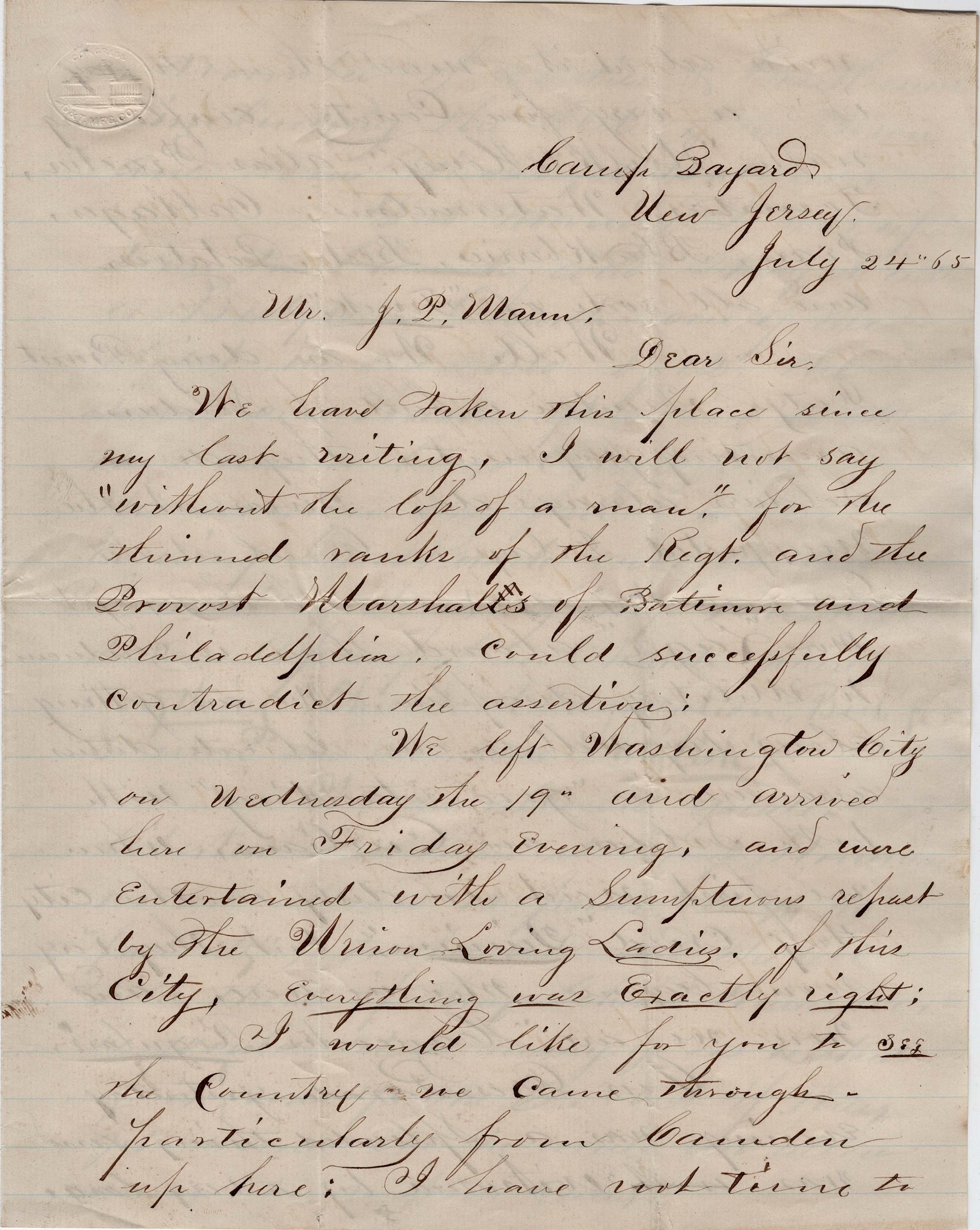 We left Washington City on Wednesday the 19th and arrived here on Friday evening, and were entertained with a sumptuous repast by the “Union Loving Ladies” of this city. Everything was exactly right. I would like for you to see the country we came through—particularly from Camden up here. I have not time to write about it more than to say it’s a very fine country, overflowing with “milk and honey,” alias peaces, tomatoes, watrmelons, cabbages, pears, blackberries, beets, potatoes, and all sorts of “Truck.”