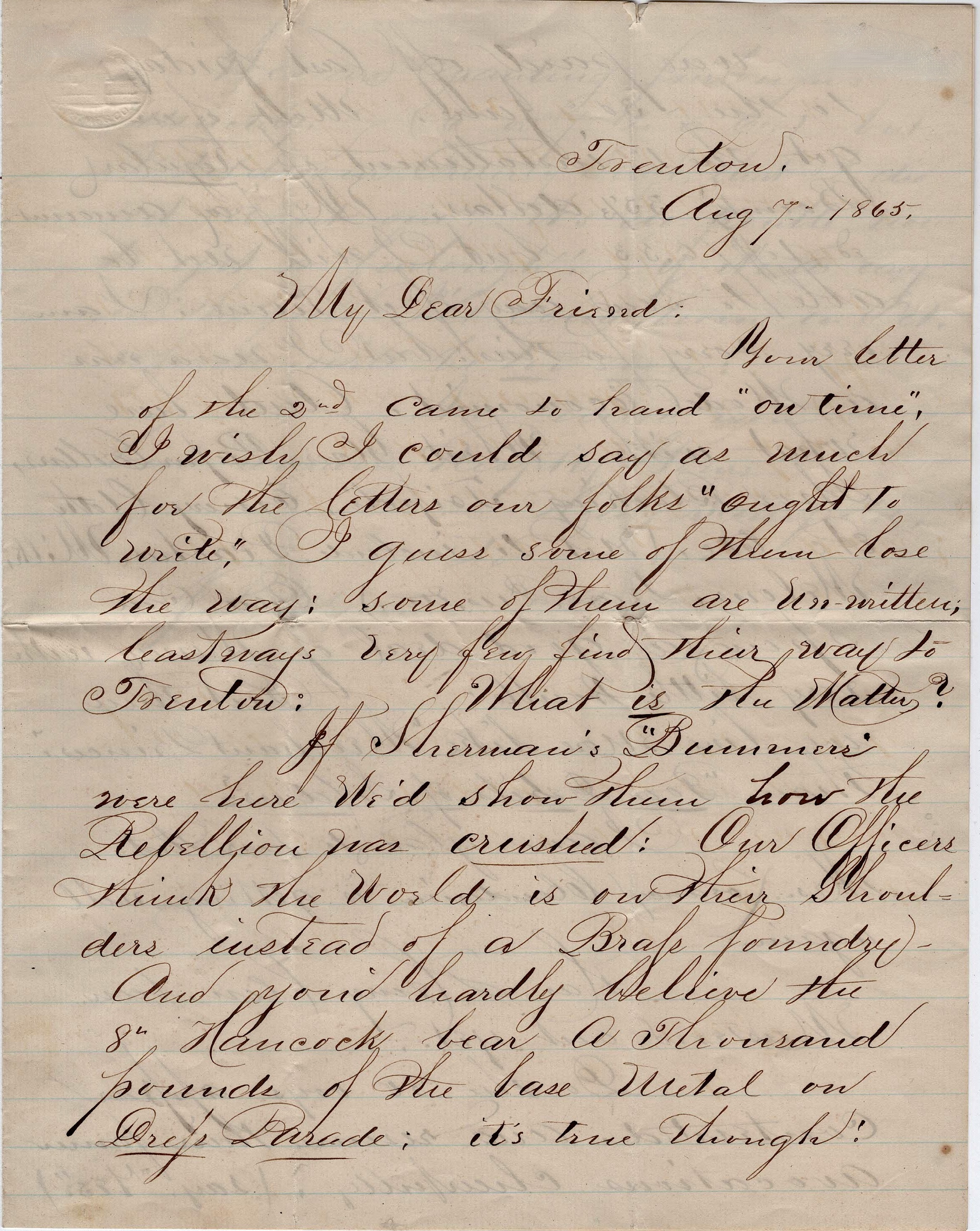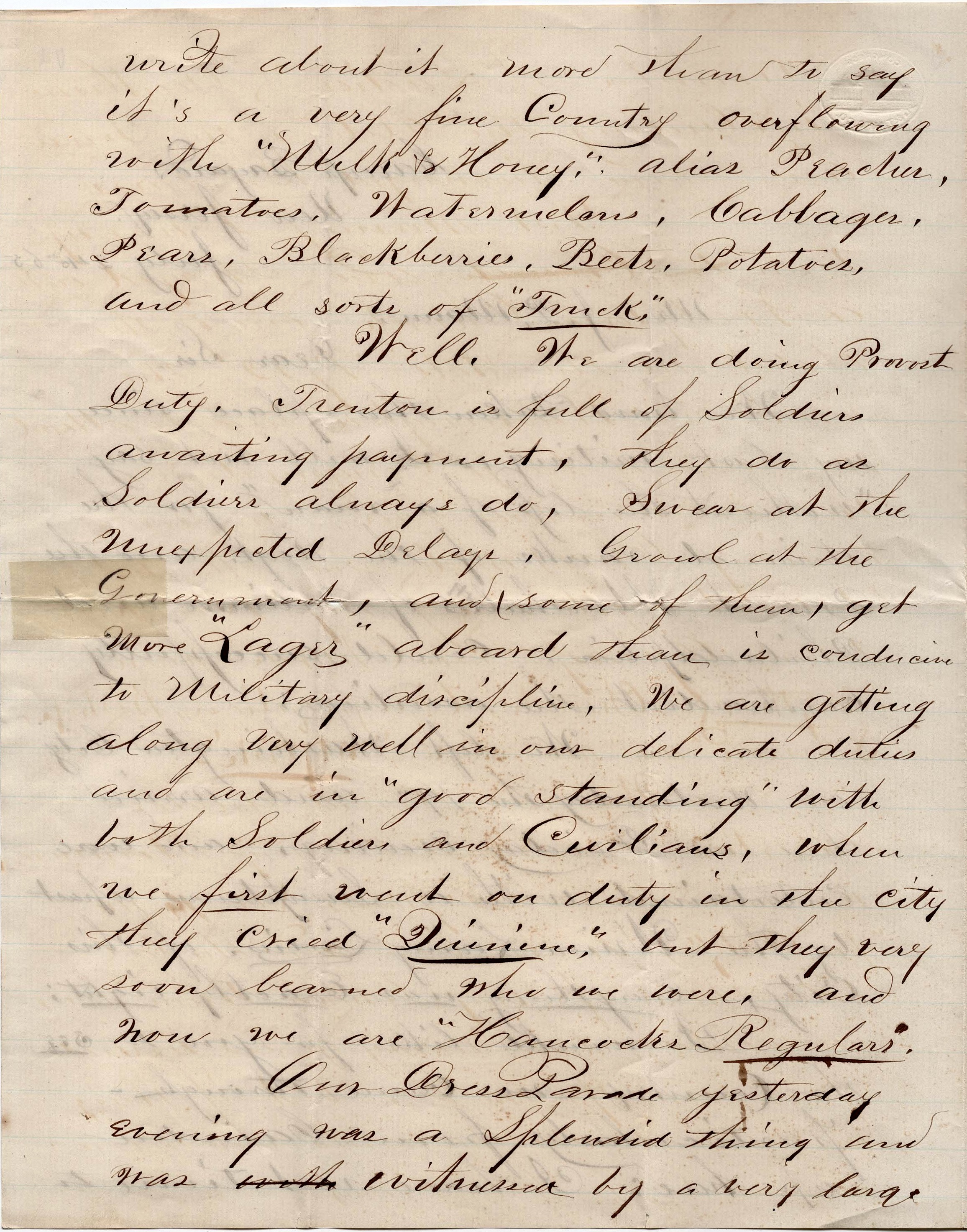 Well, we are doing Provost duty. Trenton is full of soldiers awaiting payment. They do as soldiers always do—swear at the unexpected delays, grown at the government, and (some of them) get more “Lager” aboard than is conducive to military discipline. We are getting along very well in our delicate duties and are in “good standing” with both soldiers and civilians. When we first went on duty in the city, they cried, “Quinine!” but they very soon learned who we were and now we are “Hancock’s Regulars.”