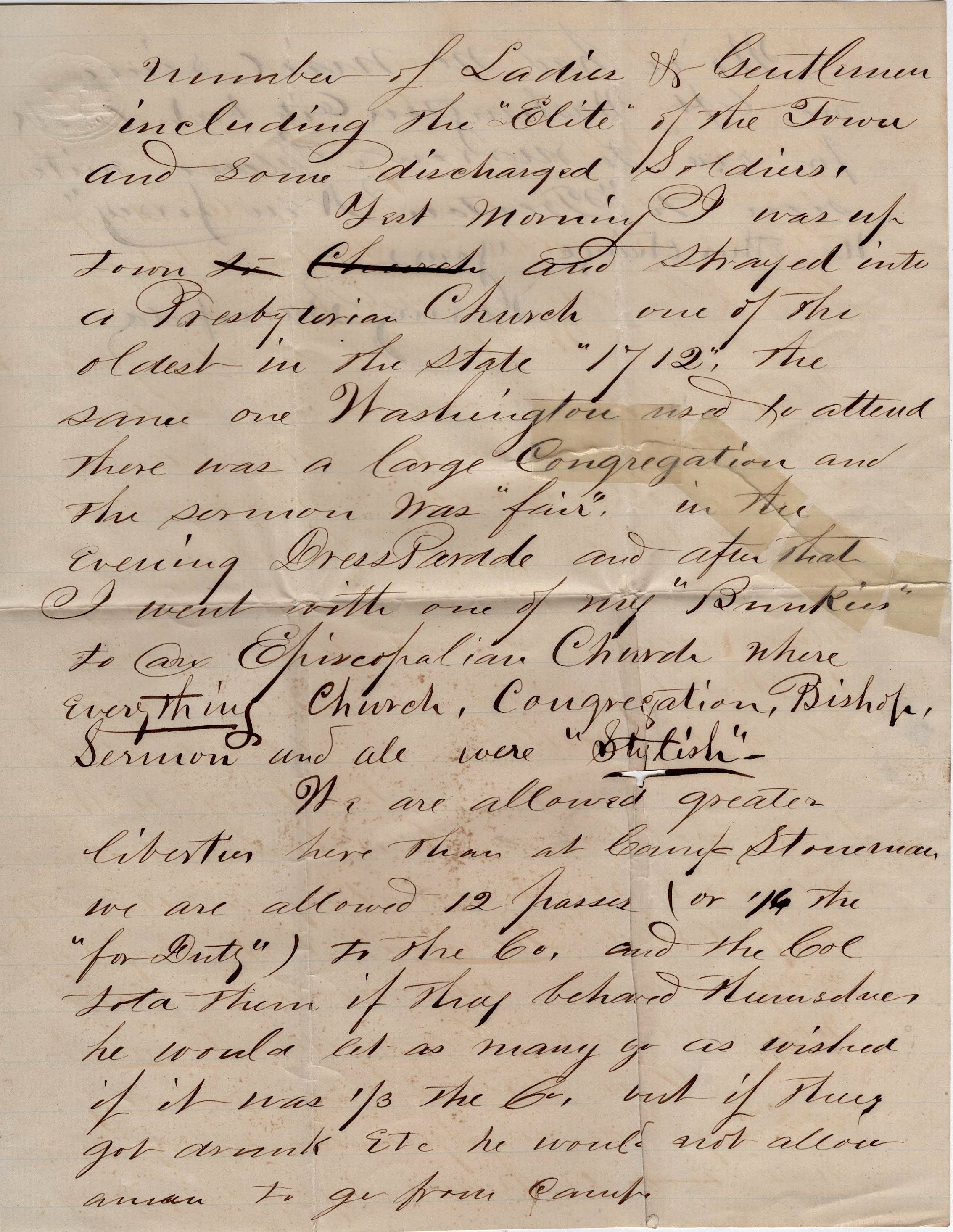 Yesterday morning I was up town and strayed into a Presbyterian Church, one of the oldest in the state—“1712”—the same one Washington used to attend. There was a large congregation and the sermon was “fair.” In the evening, dress parade and after that I went with one of my “bunkies” to an Episcopal Church where everything—church, congregation, Bishop, sermons andall—were “stylish.”
