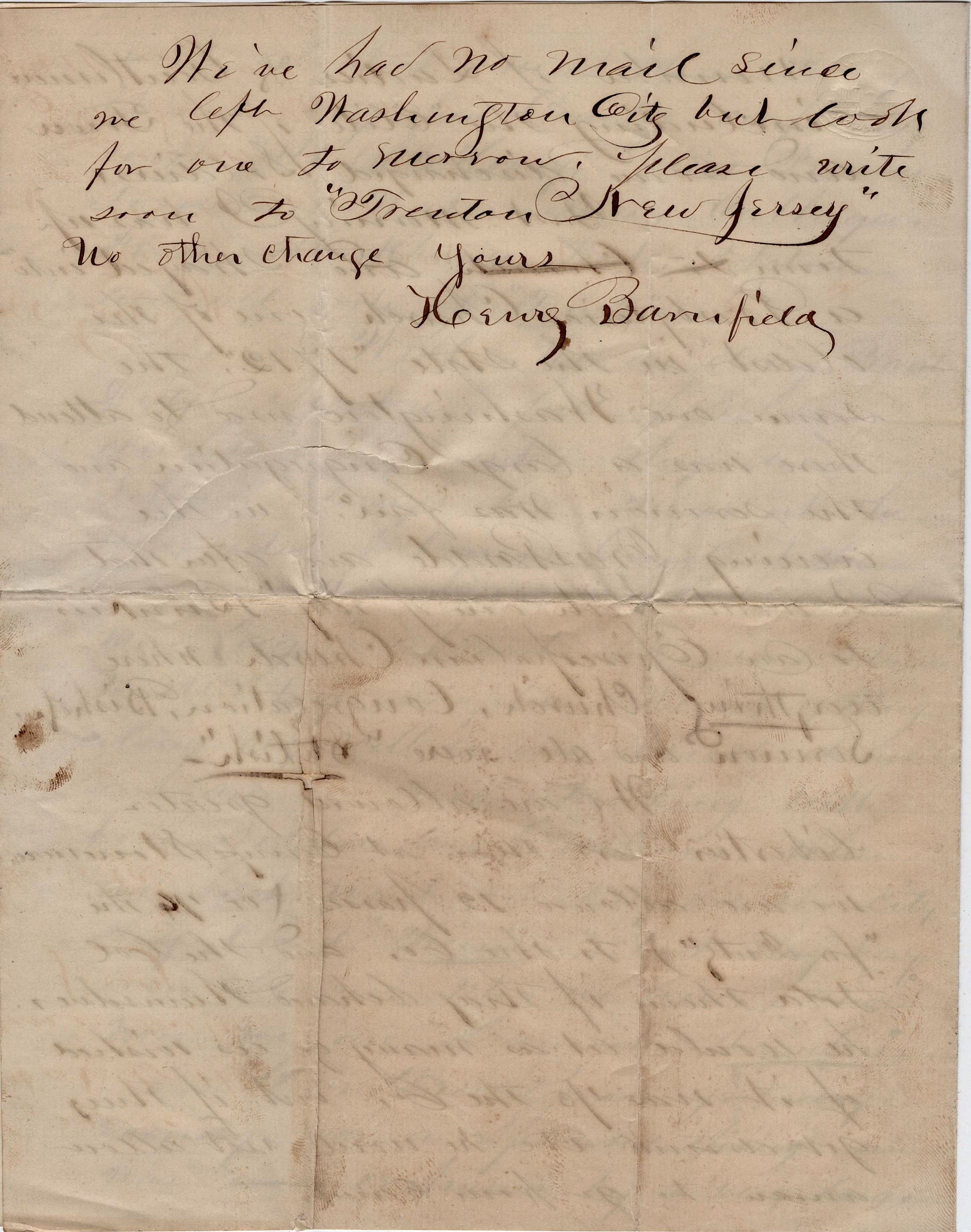 We’ve had no mail since we left Washington City but look for one tomorrow. Please write soon to Trenton, New Jersey. No other change. Yours, — Henry Barnfield