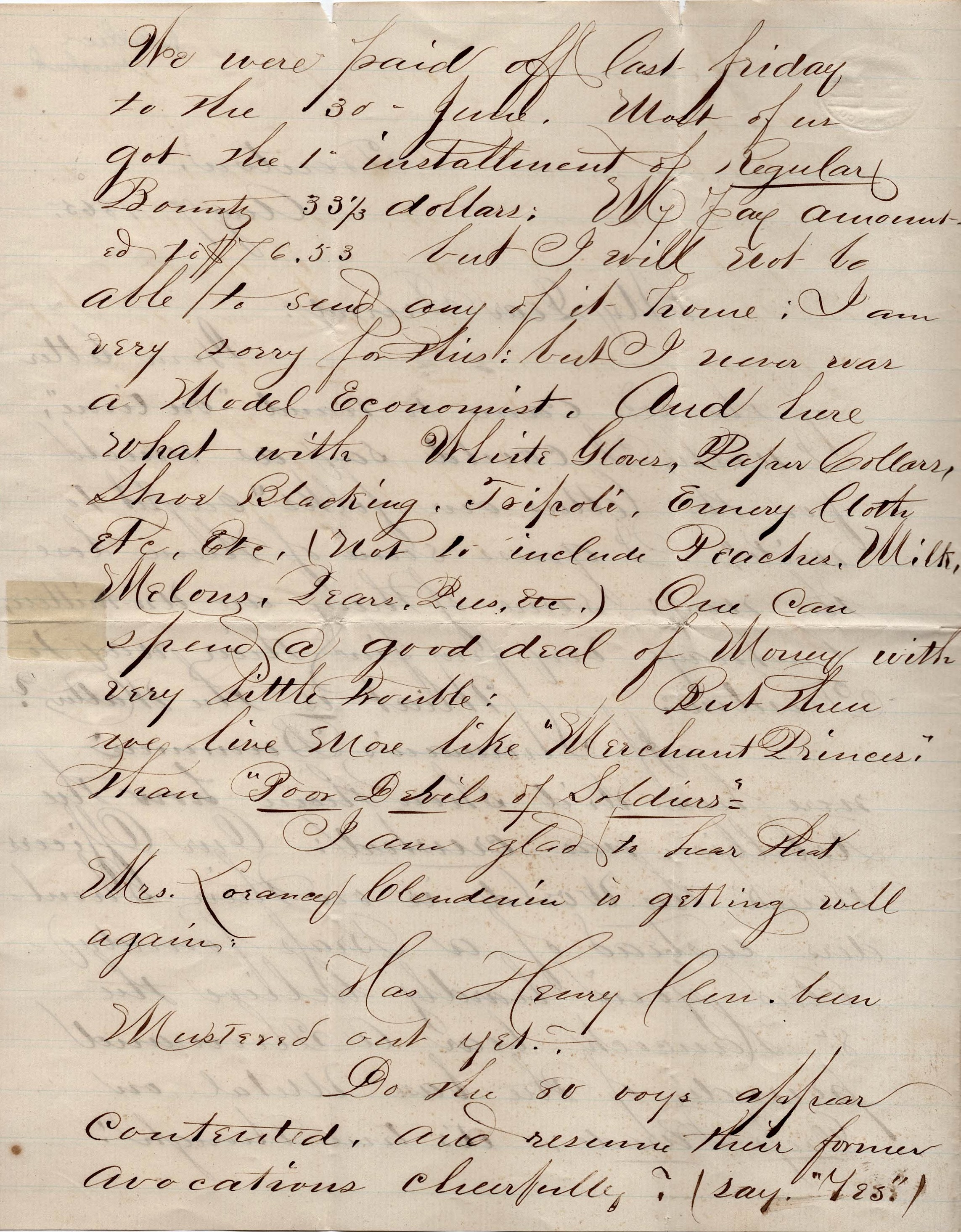 We were paid off last Friday to the 30th of June. Most of us got the 1st installment of Regular Bounty, 33.33 dollars. My pay amounted to $76.53 but I will not be able to send any of it home. I am very sorry for this but I never was a model economist. And here what with white gloves, paper collars, shoe blacking, Tripoli, emery cloth, etc. etc. (not to include peaches, milk, melons, pears, pies, &c.) One can spend a good deal of money with very little trouble. But then we live more like “merchant princes” than “poor devils of soldirs.”