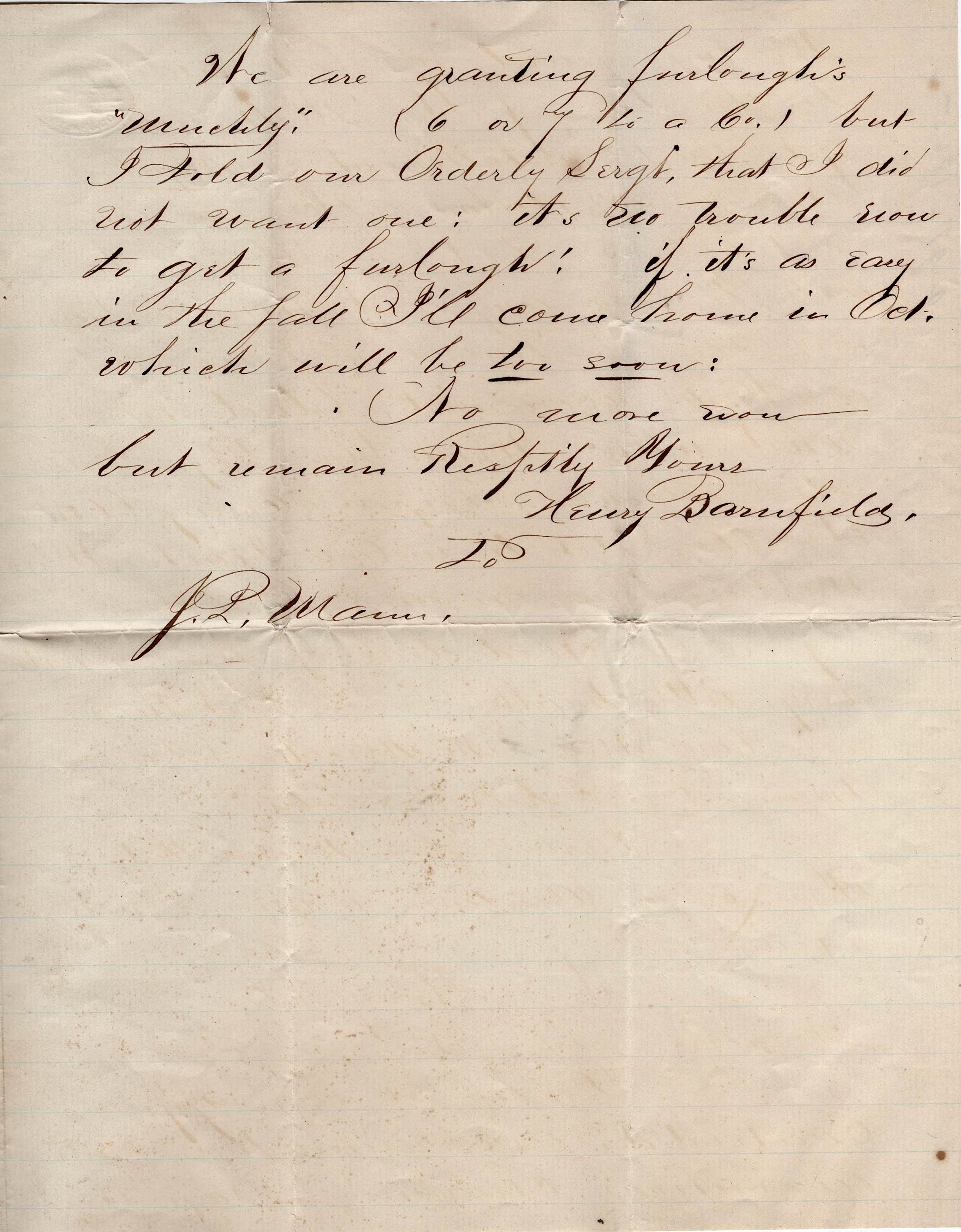 No more now. By the middle of the week, I will write you again. — Henry Barnfield
