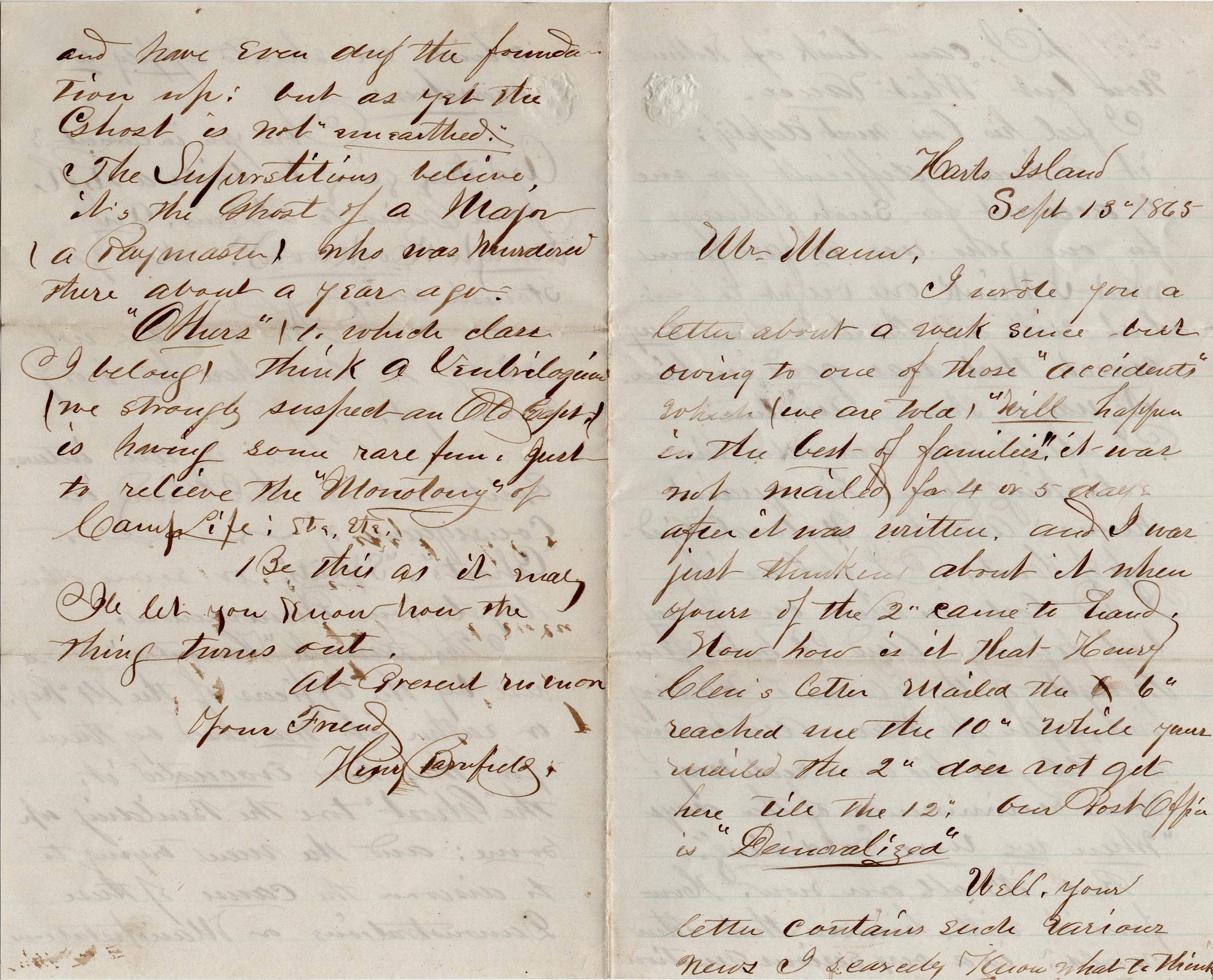 There is an intense excitement on the island in consequence of “Ghosts”, “Spirits” or some other mysterious phenomenon. The barrack “Haunted” is on used by the officers of the 14th Regiment, or rather, it was used by them for they have evacuated it. The “ghost” tore the building up some and the men, trying to discover the cause of these demonstrations or manifestations and have even dug the foundations up. But as yet the ghost is not “unearthed.” The superstitious believe it’s the ghost of a Major (a Paymaster) who was murdered there about a year ago.