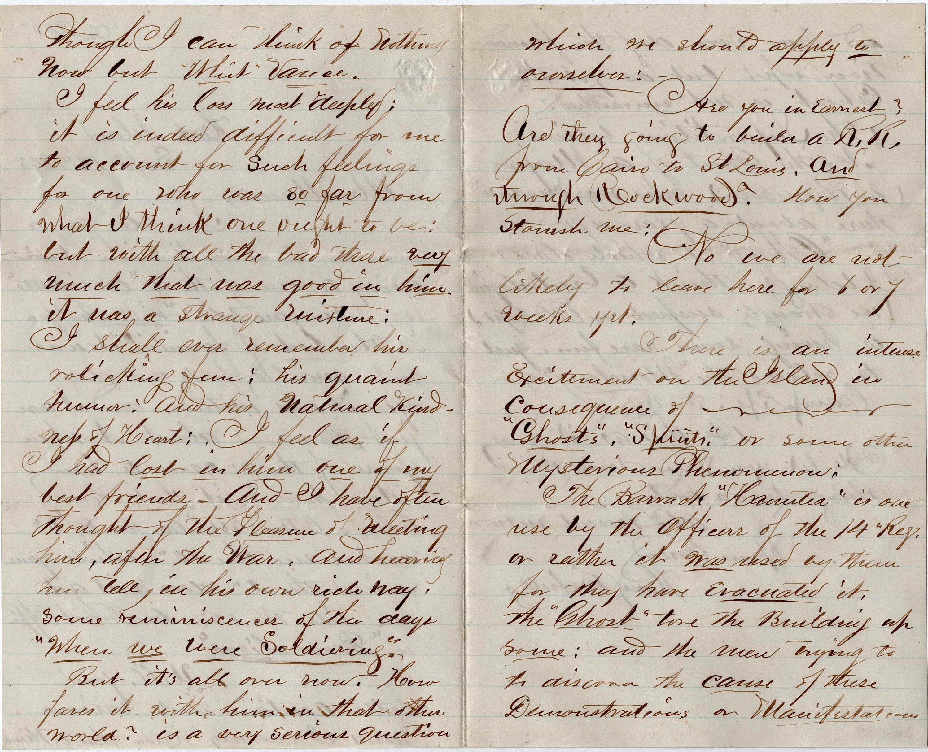 Well, your letter contains such various news I scarcely know what to think though I can think of nothing now but “Whit” Vance. I feel his loss most deeply. It is indeed difficult for me to account for such feelings for one who was so far from what i think one ought to be. But with all the bad, there was very much that was good in him. It was a strange mixture. I shall ever remember his rollicking fun, his quaint humor, and his natural kindness of heart. I feel as if I had lost in him one of my best friends. And I have often thought of the pleasure of meeting him after the war and having him tell, in his own rich way, some reminiscences of the days “when we were soldiering.” But it’s all over now. How fares it with him in that other world? is a serious question which we should apply to ourselves. 1