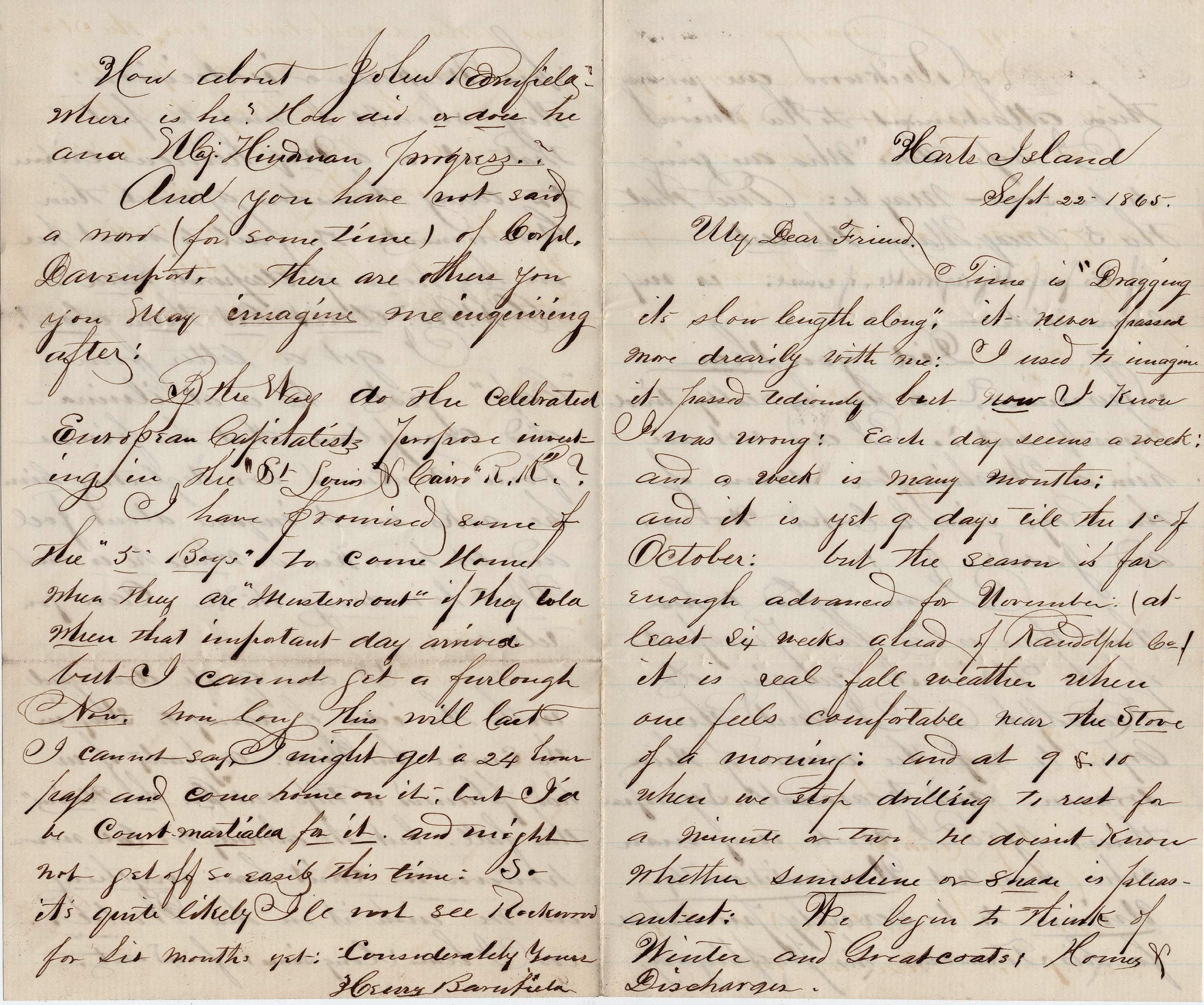 Time is “dragging its slow length along.” It never passed more drearily with us. I used to imagine it passed tediously but now I know I was wrong. Each day seems a week and a week is many months. And it is yet 9 days till the 1st of October, but the season is far enough advanced for November (at least six weeks ahead of Randolph county). It is real fall weather when one feels comfortable near the stove of a morning and at 9 and 10 when we stop drilling to rest for a minute or two, he doesn’t know whether sunshine or shade is pleasantest. We begin to think of winter and greatcoats, homes and discharges.