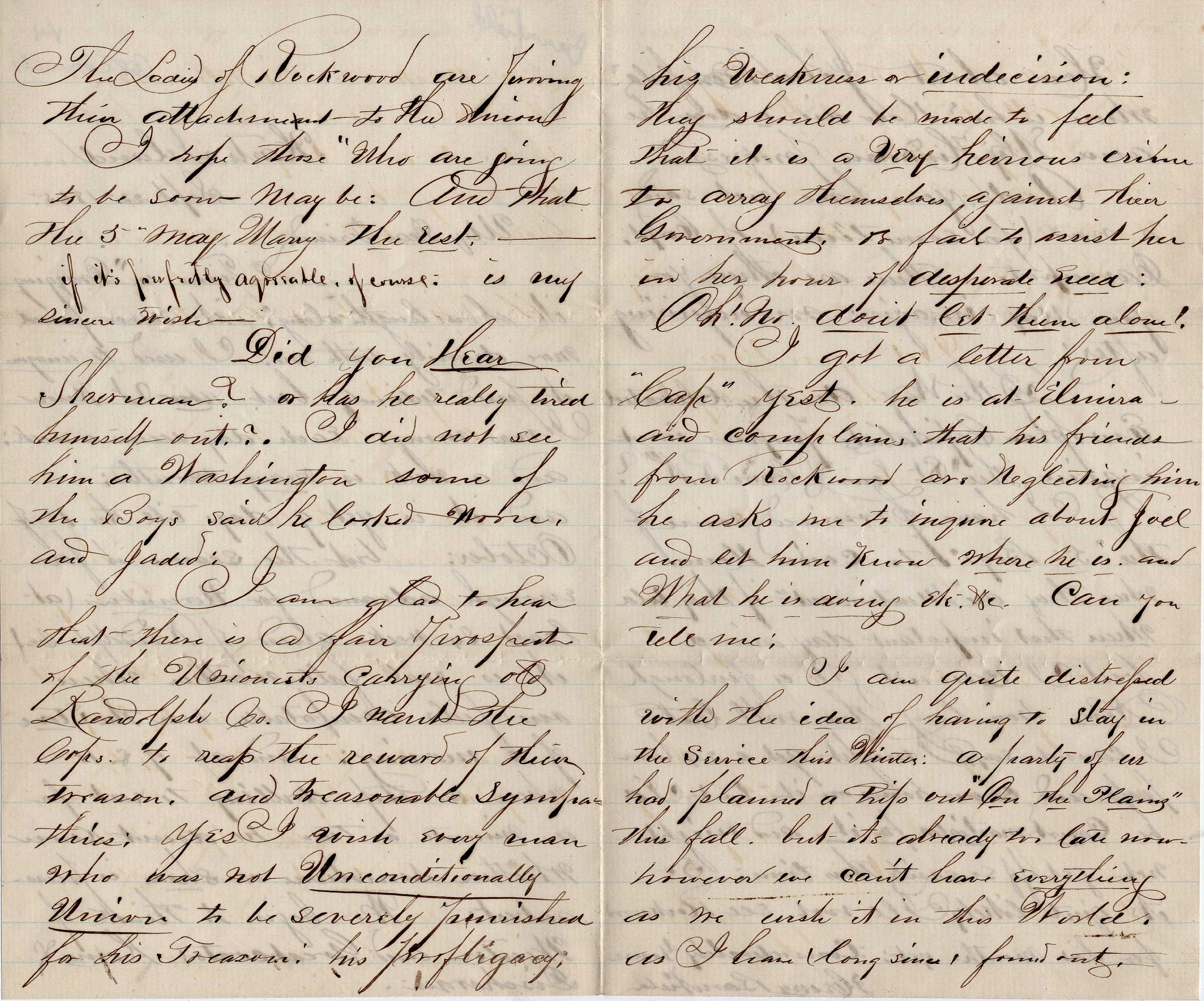 I got a letter from “Cap” yesterday. He is at Elmira and complains that his friends from Rockwood are neglecting him. He asks me to inquire about Joel and let him know where he is and what he is doing, etc., &c. Can you tell me?