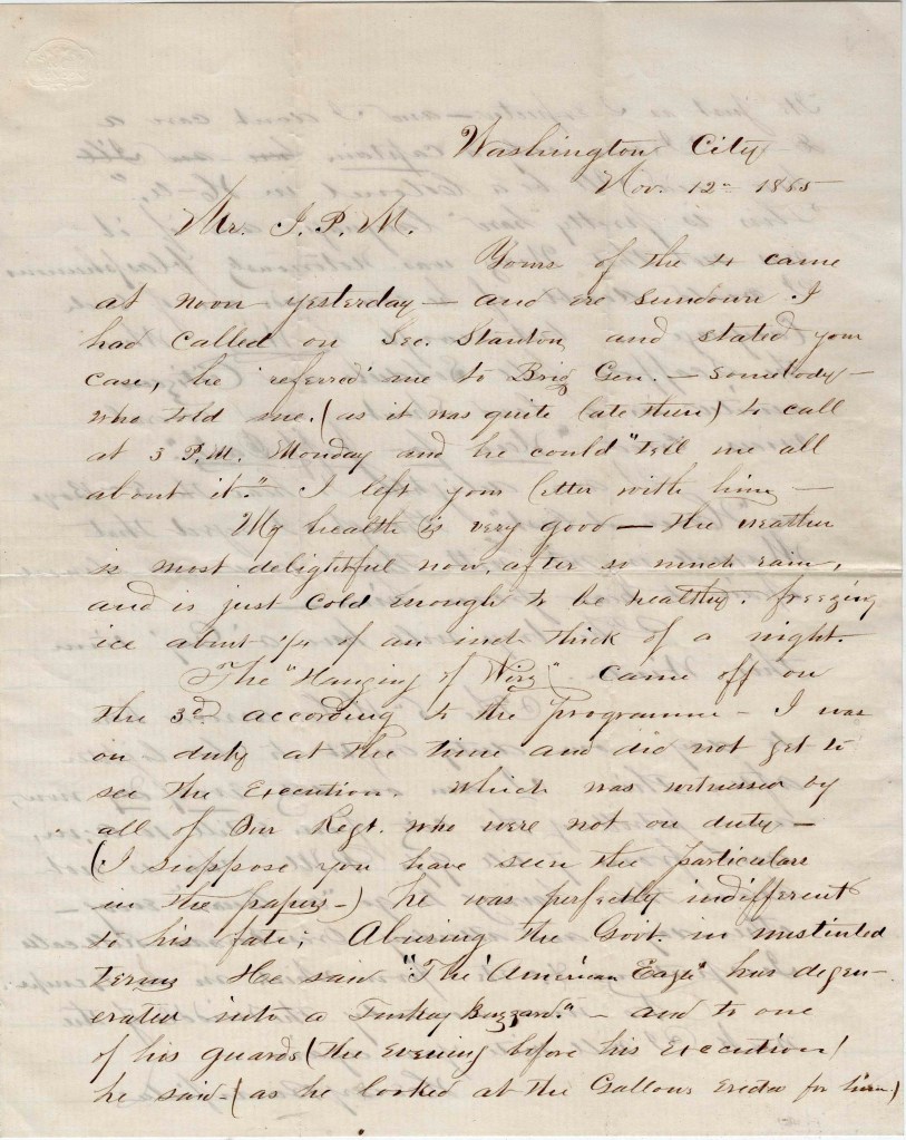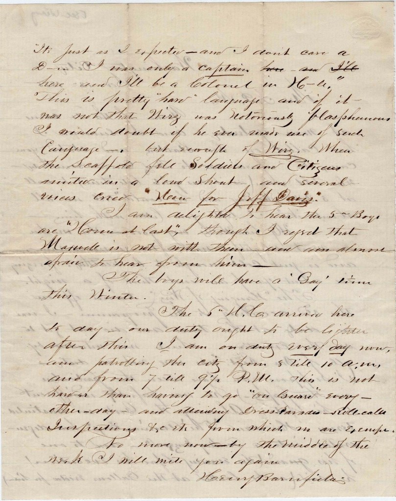 The “hanging of Wirz” came off on the 3rd according to the programme. I was on duty at the time and did not get to see the execution which was witnessed by all of our regiment who were not on duty. (I suppose you have seen the particulars in the papers.) He was perfectly indifferent to his fate, abusing the government in unstinted terms, He said “The American Eagle has degenerated into a Turkey Buzzard.” And to one of his guards (the evening before his execution) he said (as he looked at the gallows erected for him), “It’s just as I expected, and I don’t care a damn. I was only a captain here and I’ll be a Colonel in Hell.” This is pretty “hard” language and if it was not that Wirz was notoriously blasphemous, I would doubt if he ever made use of such language. But enough of Wirz. When the scaffold fell, soldiers and citizens united in a loud shout and several voices cried, “Now for Jeff Davis!” 1