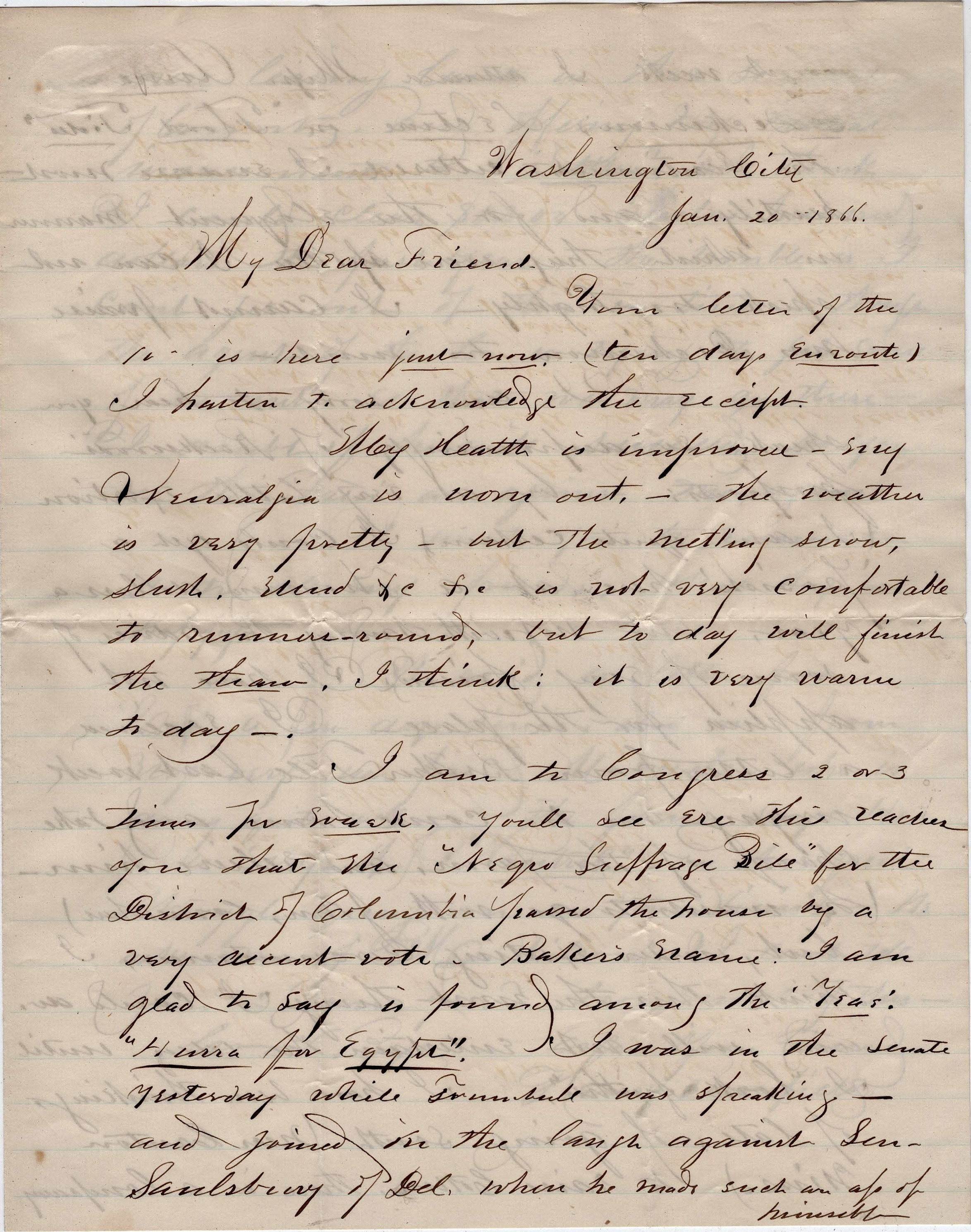 I am to Congress two or three times per week. You’ll see ere this reaches you that the “Negro Suffrage Bill” for the District of Columbia passed the House by a very decent vote. Baker’s name, I am glad to say, is found among the “yeas.” Hurrah for Egypt!” 1 I was in the Senate yesterday while Trumbull was speaking and joined in the laugh against Senator [Willard] Saulsbury of Delaware when he made such an ass of himself. 2