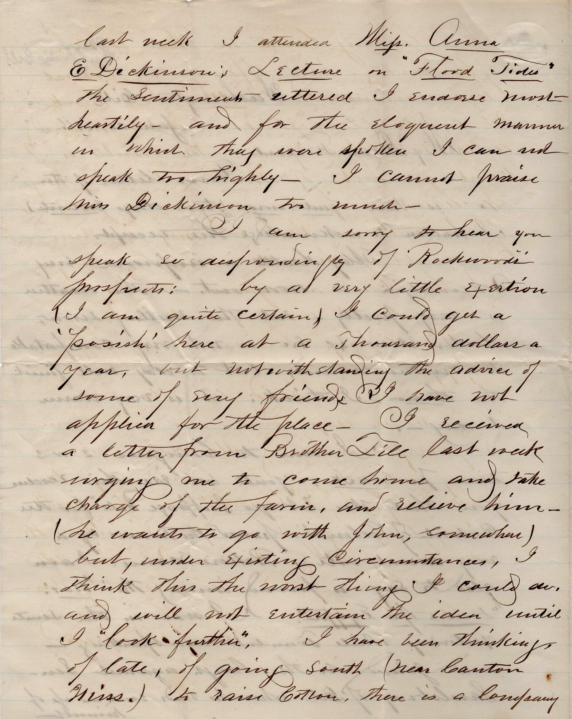 Last week I attended Miss Anna E. Dickinson’s lecture on “Flood Tides.” The sentiments uttered I endorsed most heartily and for the eloquent manner in which they were spoken I cannot speak too highly. I cannot praise Miss Dickinson too much. 3