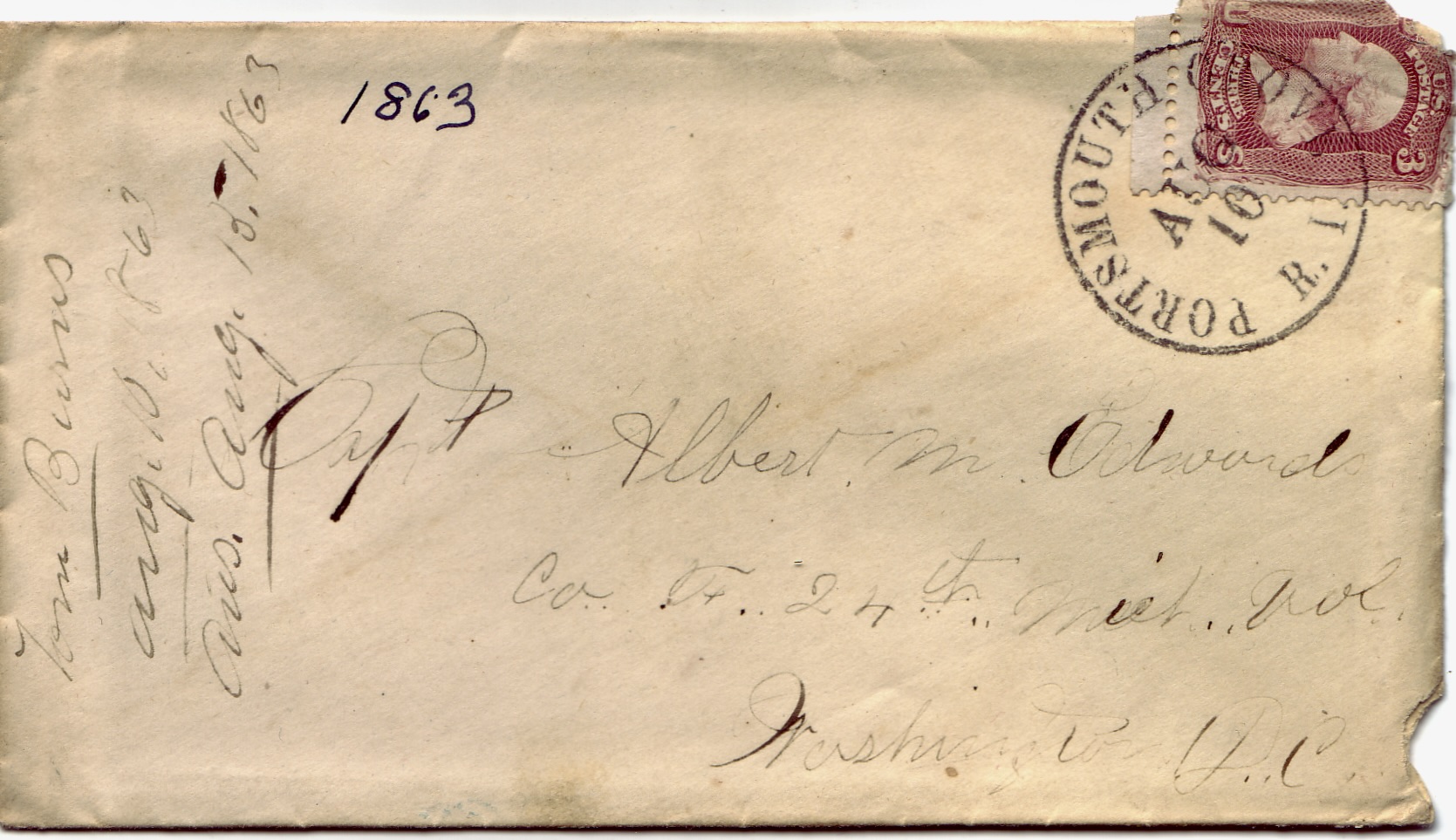 The following letter was written by Thomas Burns of Co. F, 24th Michigan Infantry while at Lovell Hospital in Portsmouth Grove, Rhode Island, in August 1863. Historians will recall that the 24th Michigan Infantry was a part of the vaunted “Black Hat” or Iron Brigade that played a critical role in the 1st day’s fight at Gettysburg, holding the Union line on Seminary Ridge long enough for the Army of the Potomac to arrive and set up a defensive line on Cemetery Ridge. Burns’ letter is directed to his captain, Albert M. Edwards, who led the regiment at Gettysburg after other senior officers were wounded. For his gallantry, he was later promoted to Major, to Lieutenant-Colonel, and finally to Brevet Colonel of the regiment.