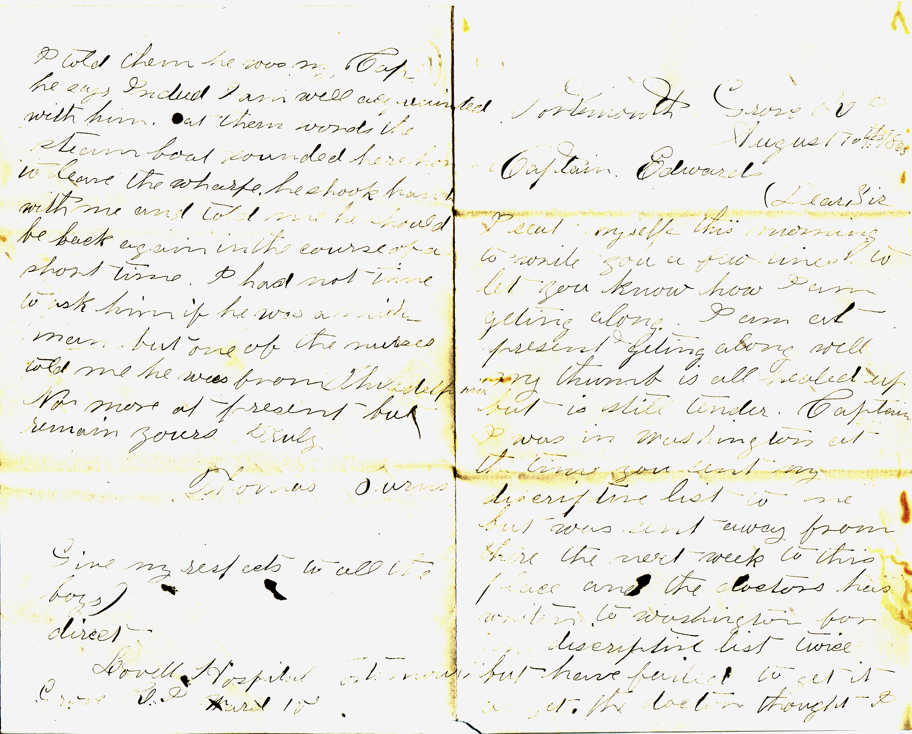 I was near forgetting [to tell you that] about two weeks ago, there was two ladies and a gentleman visitors [came] to this place, came into my ward, looked at my card, and said you belong to the 24th Michigan, and asked if I knew Captain Edwards. I told them he was my captain. He says, “Indeed! I am well acquainted with him.” At them words the steamboat sounded here for to leave the wharf. He shook hands with me and told me he should be back again in the course of a short time. I had not time to ask him if he was a Michigan man, but one of the nurses told me he was from Philadelphia.