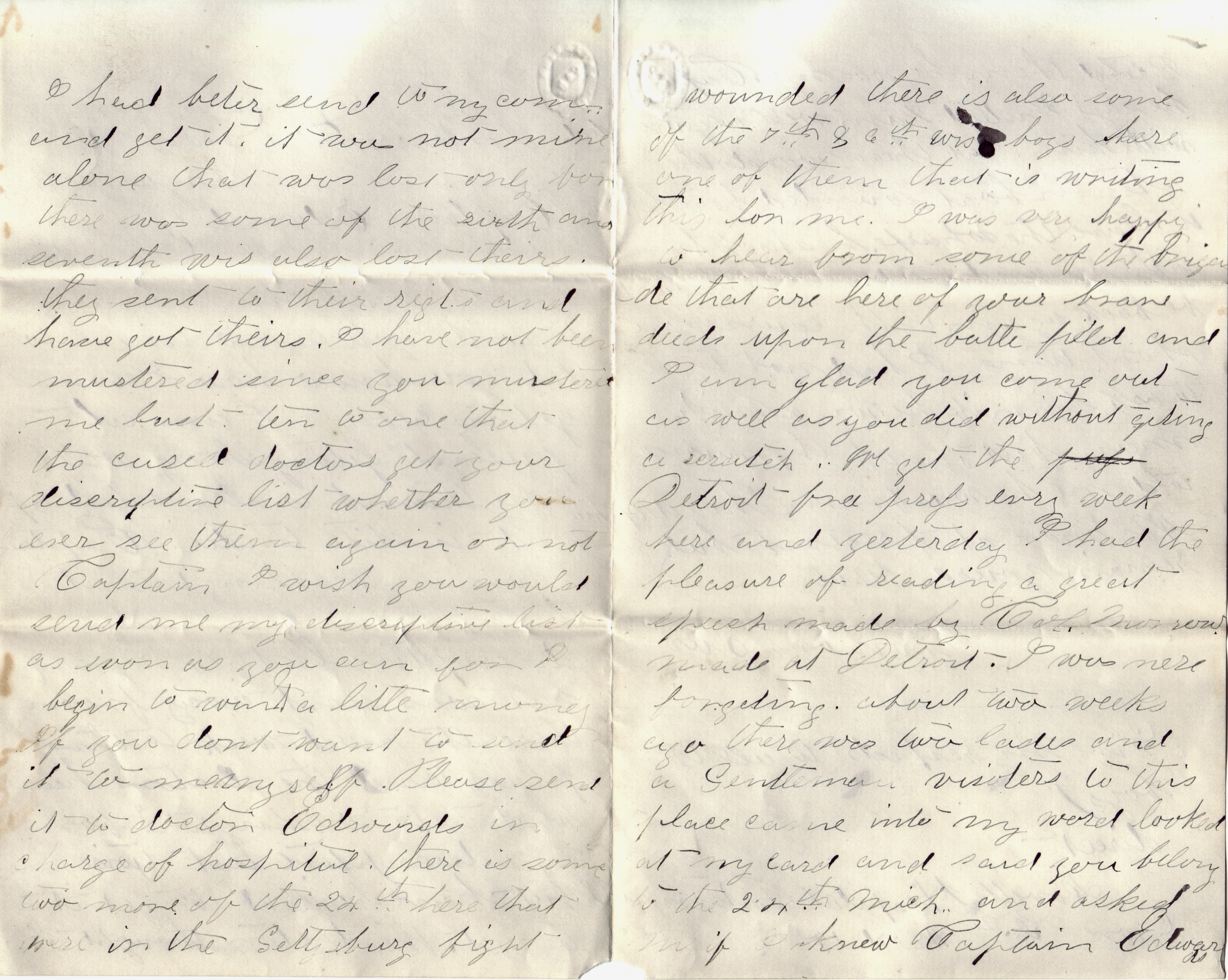 I have not been mustered since you mustered me last. Ten to one that the cussed doctors get your Descriptive List whether you ever see them again or not. Captain, I wish you would send me my Descriptive List as soon as you can for I begin to want a little money. If you don’t want to send it to myself, please send it to Doctor [Lewis A.] Edwards in charge of the hospital. There is some two more of the 24th [Michigan] here that were in the Gettysburg fight wounded. There is also some of the 7th & 6th Wisconsin boys here—one of them that is writing this for me.