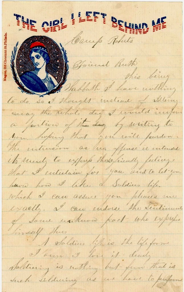 This being Sabbath I have nothing to do so I thought instead of idling away the whole day I would improve a portion of it by writing to you, hoping you will pardon the intrusion as no offense is intended. It’s merely to express these friendly feelings that I entertain for you and to let you know how I like a soldier’s life which I can assure you pleases me exactly. I can endorse the sentiments of some unknown poet who expresses himself thus.