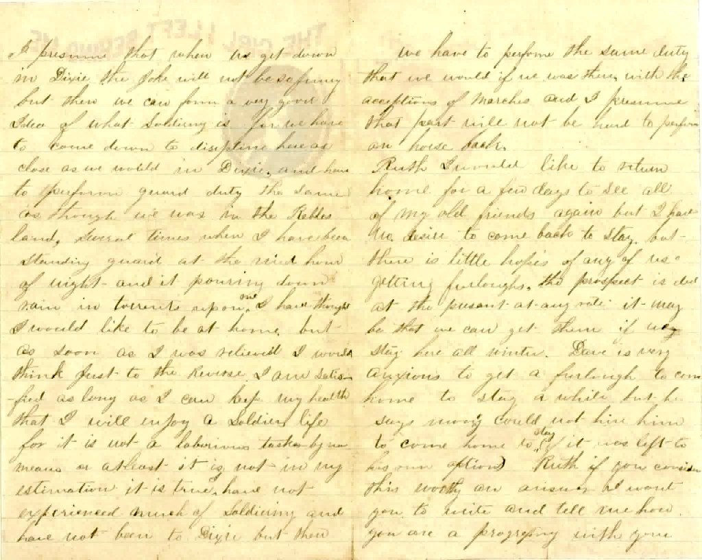 Ruth, I would like to return home for a few days to see all of my old friends again but I have no desire to come back to stay. But there is little hopes of any of us getting furloughs. The prospect is dead at the present at any rate. It may be that we can get them if we stay here all winter. Dave is very anxious to geta furlough to come home to stay a while but he says [ ] could not hire him to come home to stay if it was left to his own action.