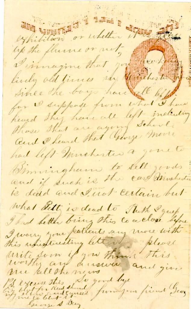 Ruth, if you consider this worthy and answer, I want you to write and tell me how you are a progressing with your exhibition or whether it is gone up the flume or not. I imagine that you are having lively old times in Winchester now since the boys have all left for I suppose from what I have heard they have all left including those that are agoing to school. And I heard that George Moore had left Winchester and gone to Birmingham to sell goods. And if such is the case, Winchester is dead and I am not certain but what Betty is dead too. Ruth, I guess I had better bring this to a close before I worry your patience any more with this uninteresting letter. Please write soon if you think worthy an answer and give me all the news. So goodbye, from your friend, — George