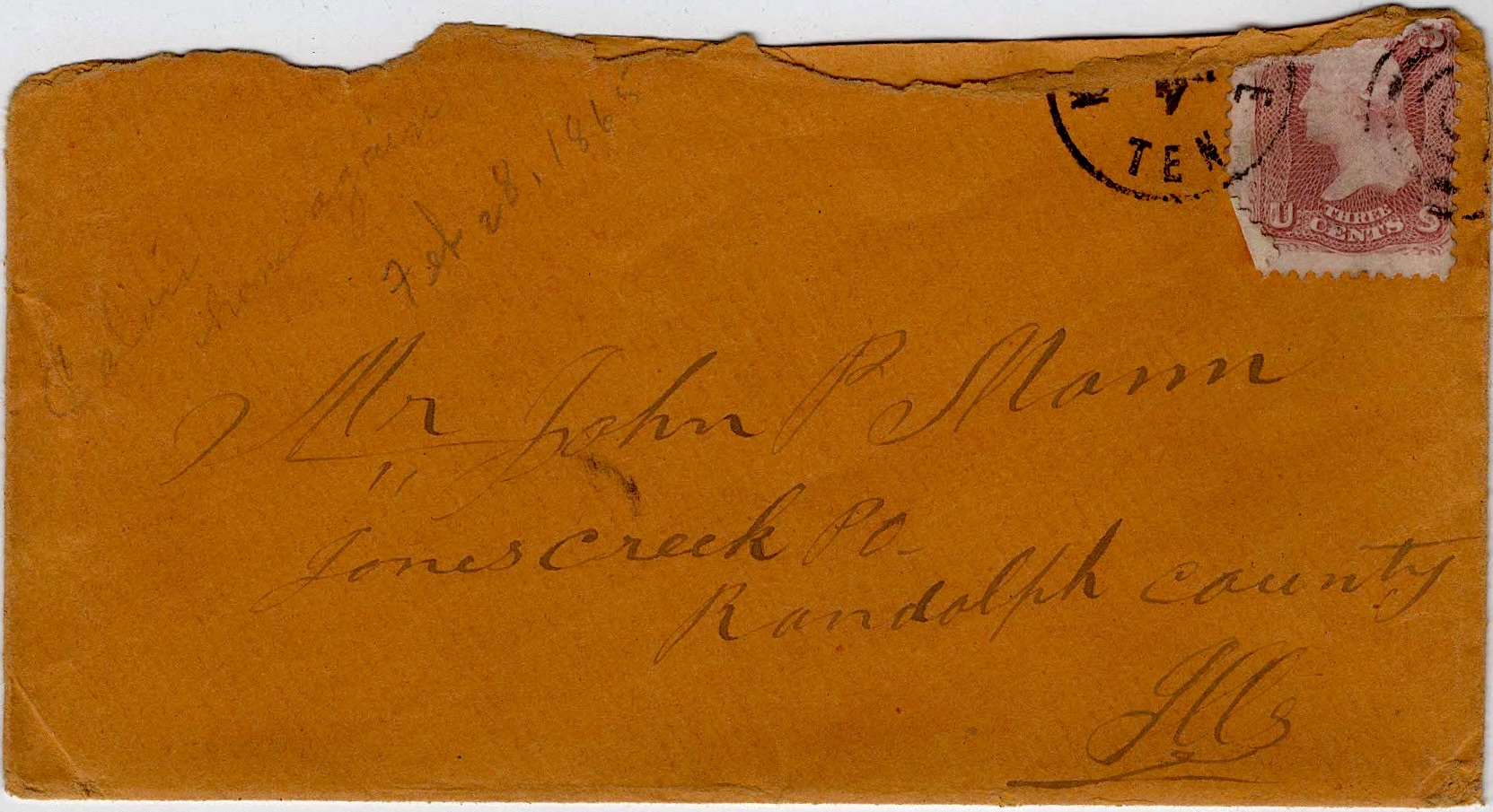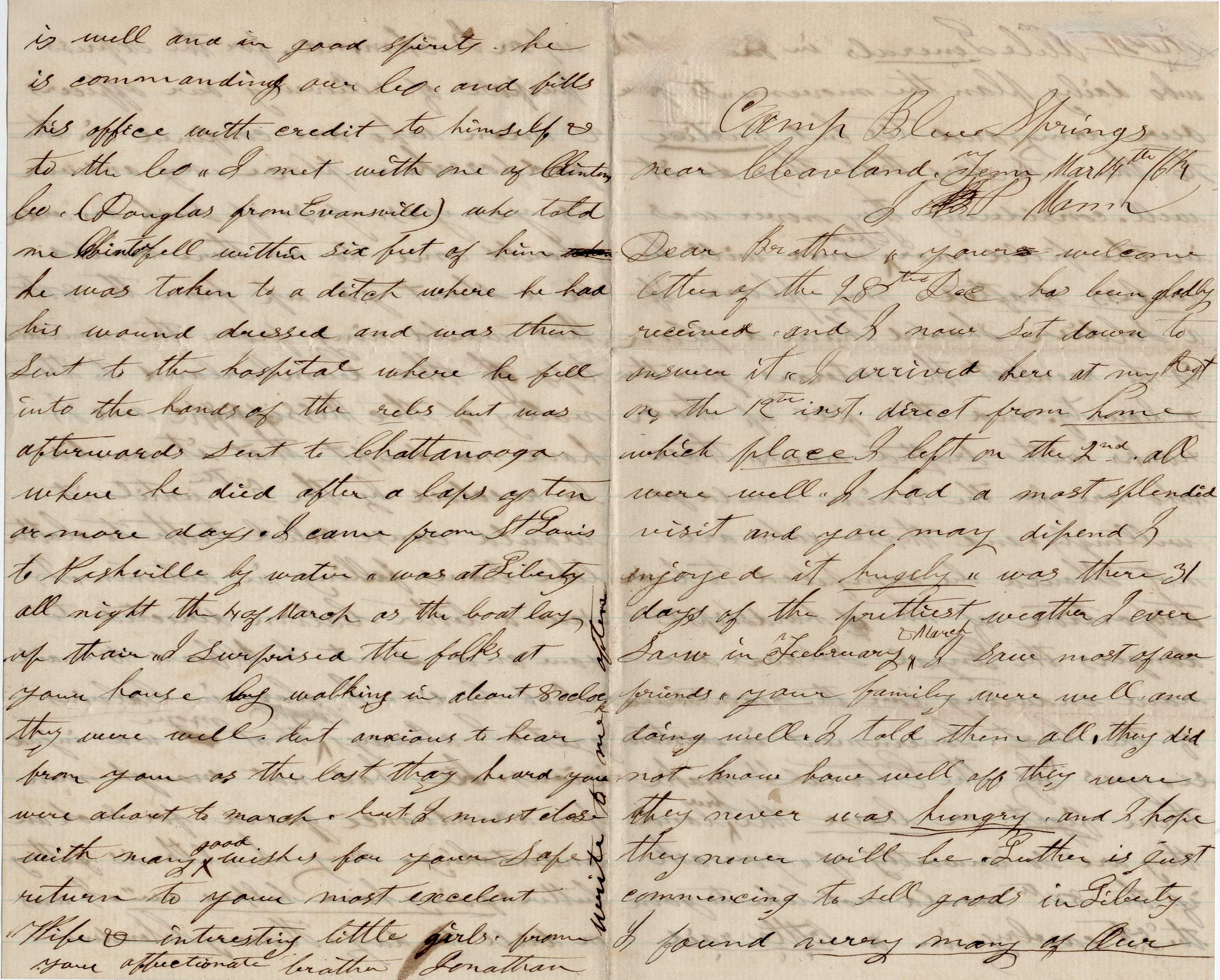 I came from St. Louis to Nashville by water. Was at Liberty all night the 4th of March as the boat lay up there. I surprised the folks at your house by walking in about 8 o’clock. They were well but anxious to hear from you as they last they heard you were about to march. But I must close with many good wishes for your safe return to your most excellent wife & interesting little girls. From your affectionate brother, Jonathan