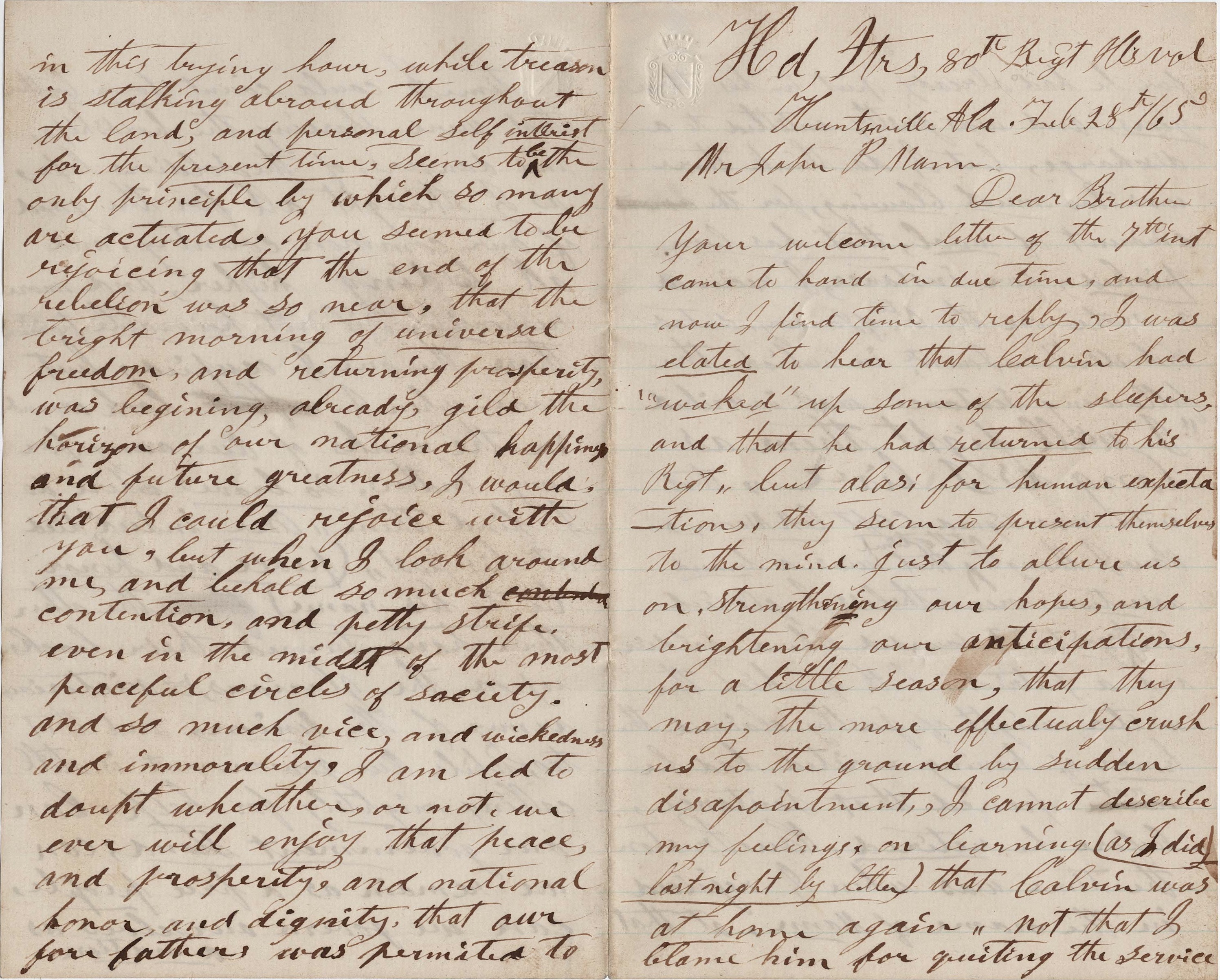 You seemed to be rejoicing that the end of the rebellion was so near that the bright morning of universal freedom and returning prosperity was beginning already gild[ing] the horizon of our national happiness and future greatness. I would that I could rejoice with you, but when I look around me and behold so much contention, and petty strife, even in the midst of the most peaceful circles of society, and so much vice and wickedness and immorality, I am led to doubt whether or not we ever will enjoy that peace, and prosperity, and national honor and dignity that our forefathers was permitted to enjoy after they had come through the fires of want, and persecution and oppression for a long series of years.
