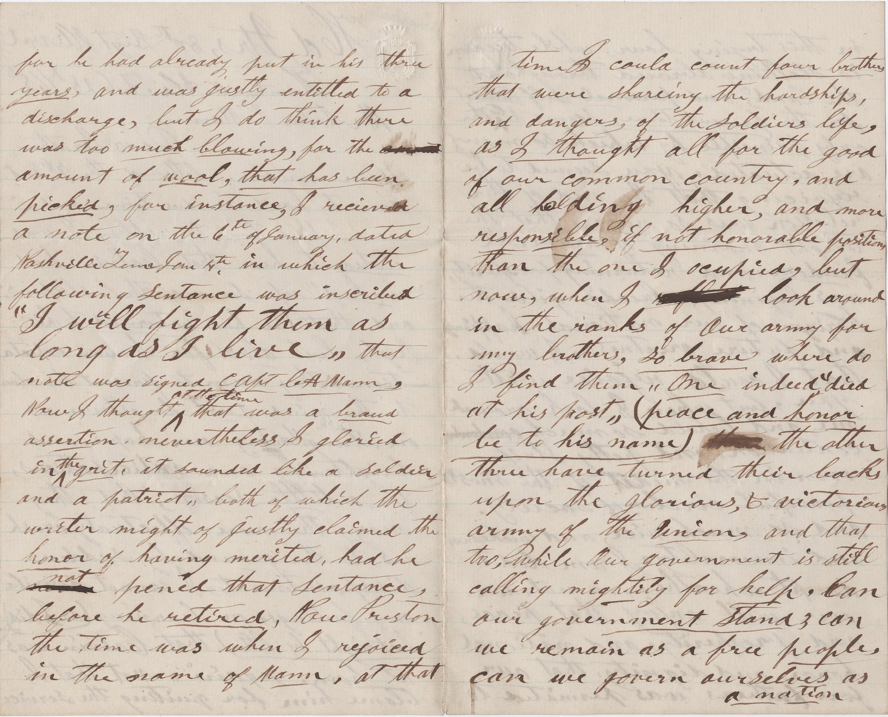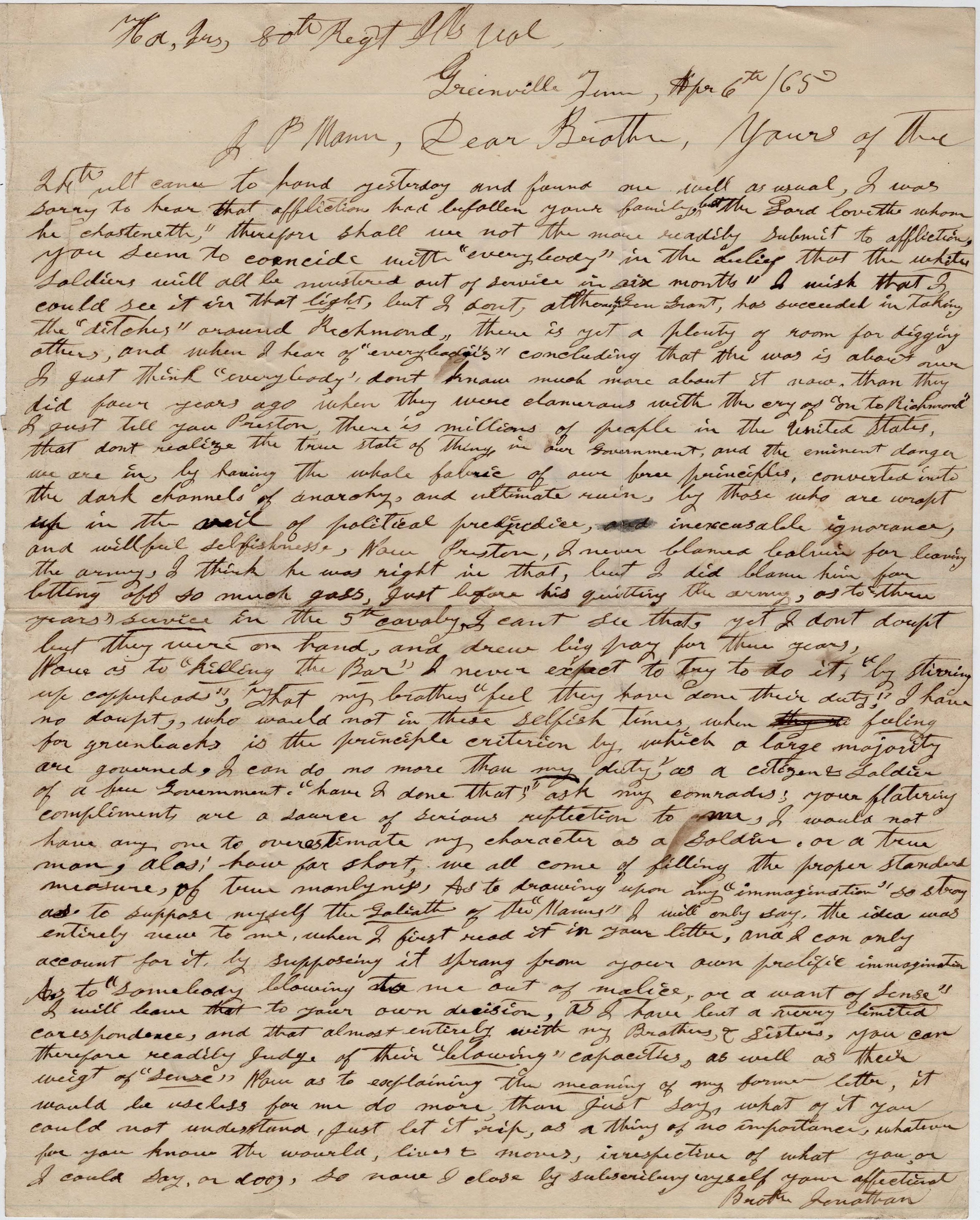 Now I thought at the time that was a brand assertion. Nevertheless, I gloried in the grit. It sounded like a soldier and a patriot, both of which the writer might of justly claimed the honor of having merited, had he not penned that sentence, before he retired. Now, Preston, the time was when I rejoiced in the name of Mann. At that time I could count four brothers that were sharing the hardships and dangers of the soldier’s life, as I thought, all for the good of our common country, and all holding higher and more responsible—if not honorable—positions than the one I occupied. But now, when I look around in the ranks of our army for my brothers so brave, where do I find them? One indeed “died at his post” (peace and honor be to his name) the other three have turned their backs upon the glorious & victorious army of the Union, and that too, while our government is still calling mightily for help. Can our government stand? can we remain as a free people? can we govern ourselves as a nation in this trying hour while treason is stalking abroad throughout the land, and personal self-interest for the present time seems to be the only principle by which so many are actuated.