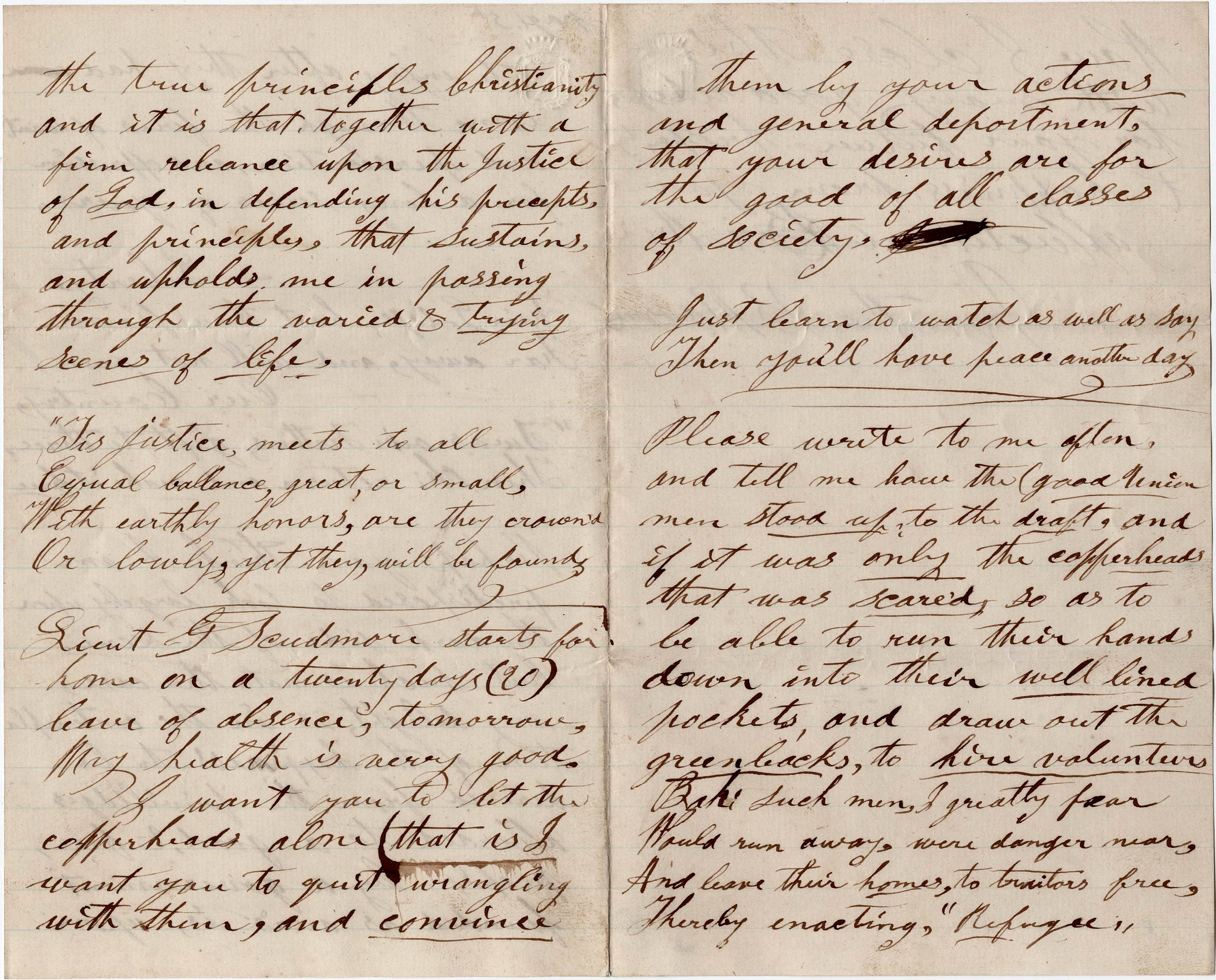 Please write to me often and tell me how the good Union men stood up to the draft, and if it was only the Copperheads that was scared, so as to be able to run their hands down into their well lined pockets and draw out the greenbacks to hire volunteers. Bah! such men I greatly fear would run away were danger near, and leave their homes, to traitors free, thereby enacting, “Refugee.”
