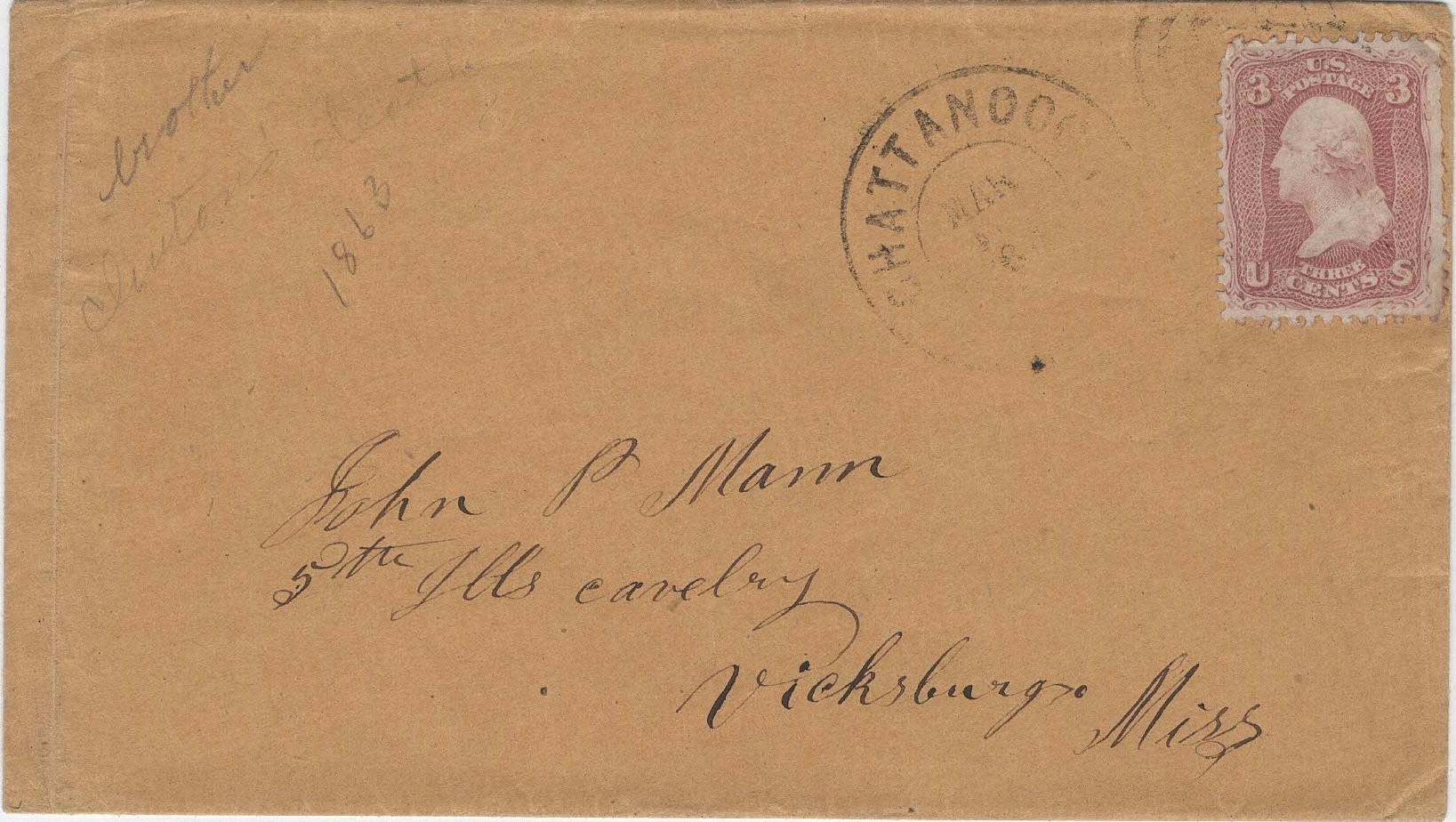 He wrote the letters to his older brother, John Preston (“J. P.”) Mann (1822-1908), who served from 31 August 1861 to 27 October 1865 in the 5th Illinois Cavalry along with another brother, 30 year-old Calvin Anderson Mann (1833-1902). Both brothers were officers, Calvin rising to the rank of Captain of Co. K. During the seige of Vicksburg, Capt. Calvin Mann led a detachment of 40 men on a daring raid behind enemy lines that resulted in his capture. See Mann’s Raid.