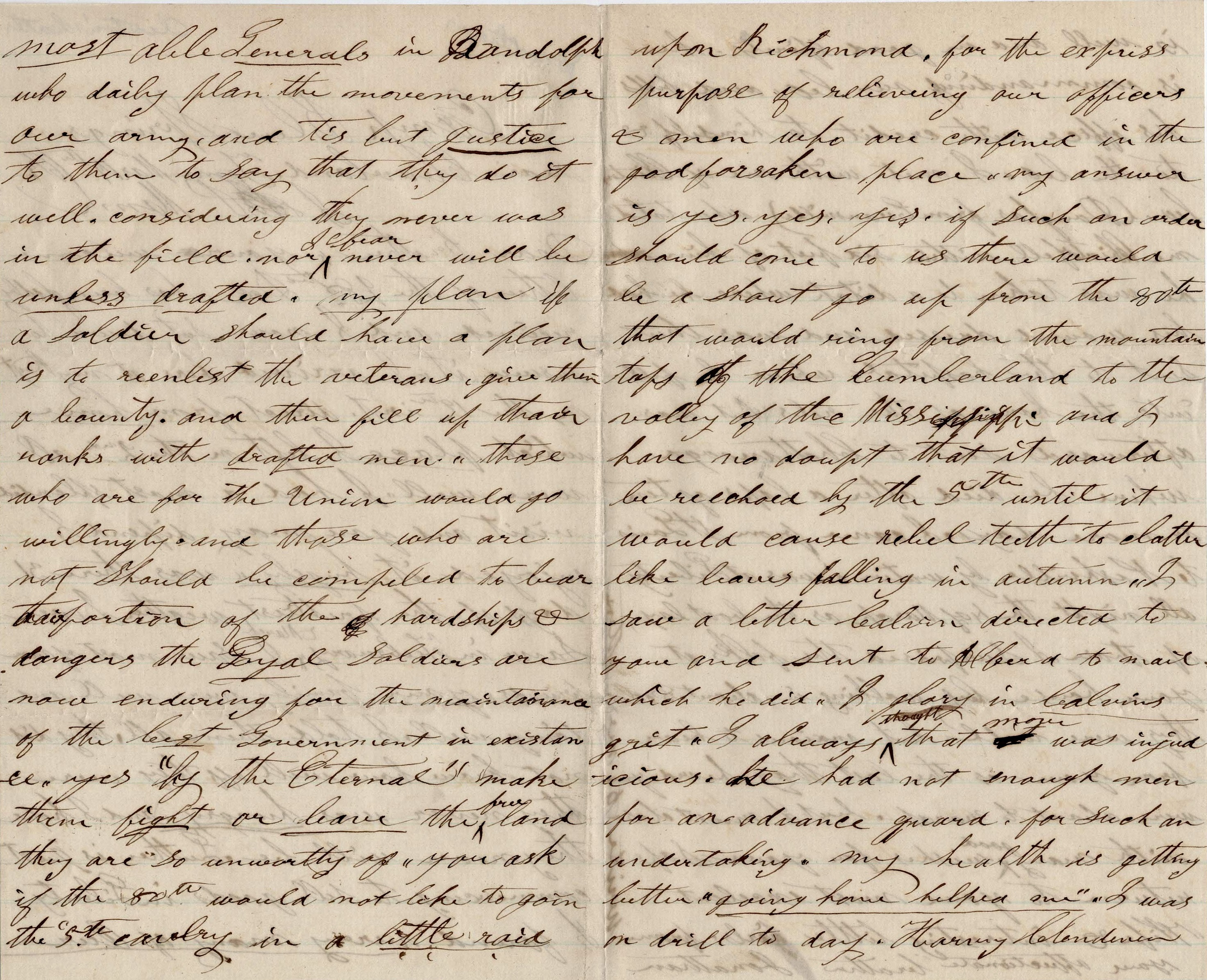 I found very many of our most able Generals in Randolph who daily plan the movements for our army and tis but justice to them to say that they do it well, considering they never was in the field nor I fear never will be unless drafted. My plan—if a soldier should have a plan—is to reenlist the veterans, give them a bounty, and then fill up the ranks with drafted men. Those who are for the Union would go willingly and those who are not, should be compelled to bear their portion of the hardships & dangers the loyal soldiers are now enduring for the maintenance of the best government in existence. Yes, “by the Eternal,” make them fight or leave the free land they are “so unworthy of.”