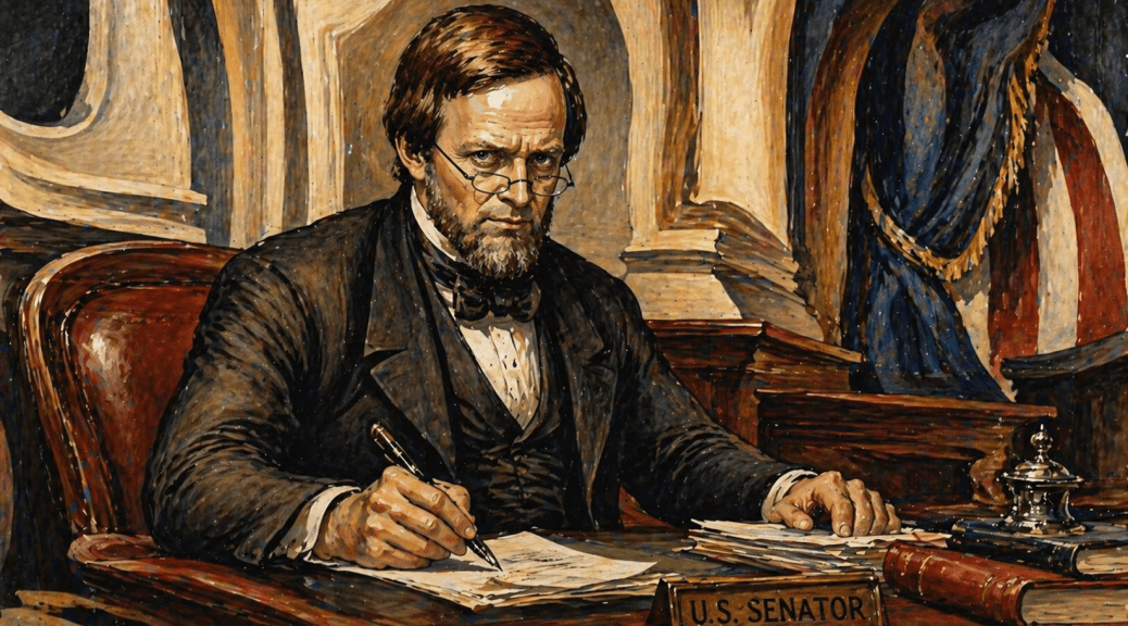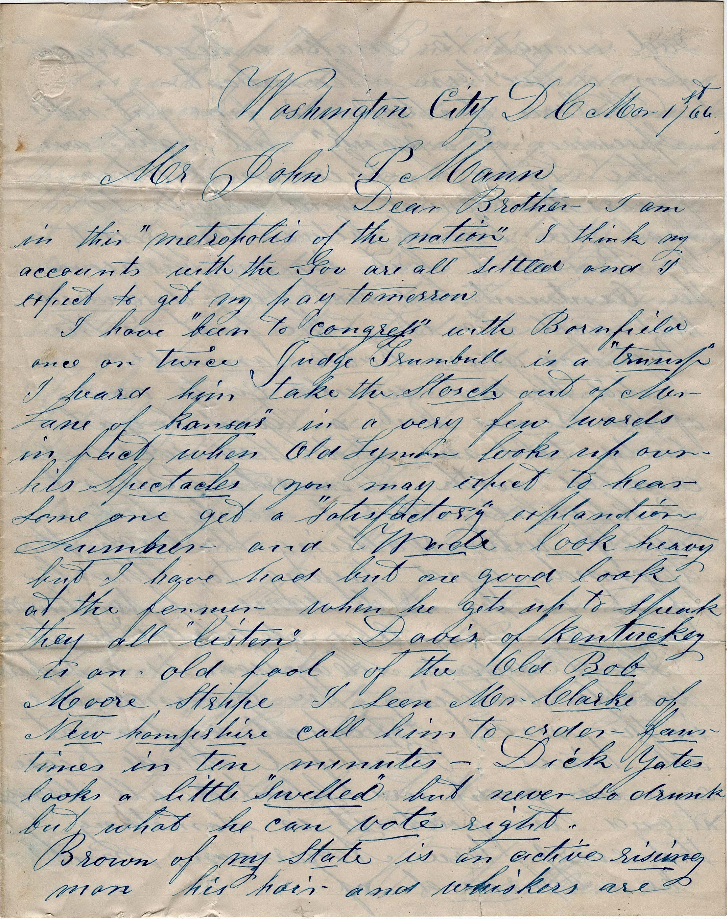I have “been to Congress” with [Thomas Henry] Barnfield once or twice. Judge [Lyman] Trumbull is a “trump.” I heard him take the starch out of Mr. [James H.] Lane of Kansas in a very few words. In fact, when Old Lyman looks up over his spectacles, you may expect to hear someone get a “satisfactory” explanation. [Charles] Sumner and [Benjamin] Wade look heavy but I have had but one good look at the former. When he gets up to speak, they all listen. [Garrett] Davis of Kentucky is an old fool of the Old Bob Moore stripe. I seen Mr. [Daniel] Clarke of New Hampshire call him to order four times in ten minutes. Dick [Richard] Yates looks a little “swelled” but never so drunk but what he can vote right.
