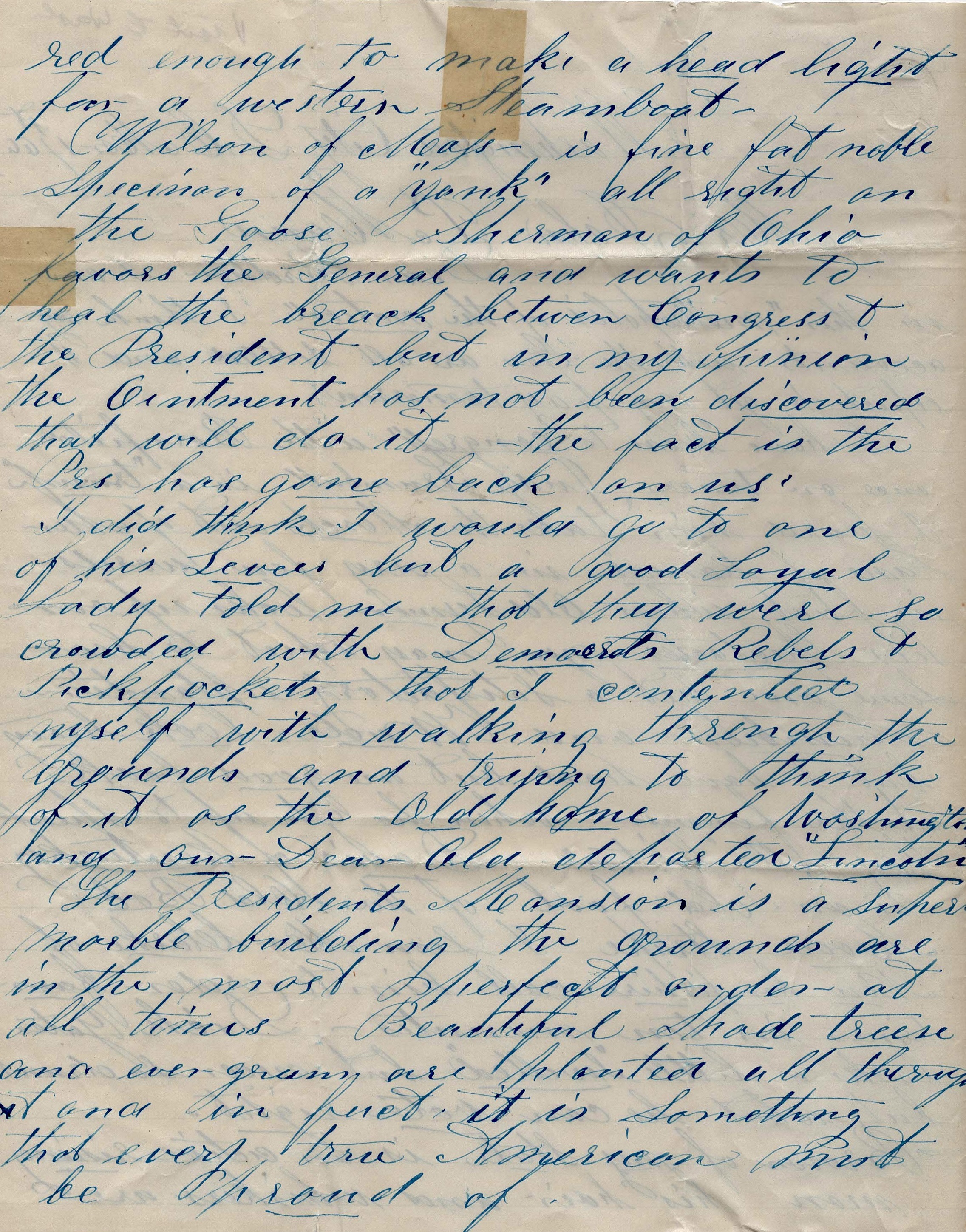 [Benjamin Gratz] Brown of my state [Missouri] is an active rising man. His hair and whiskers are red enough to make a head light for a western steamboat. [Henry] Wilson of Massachusetts is [a] fine, fat, noble specimen of a “yank”—all right on the goose. [John] Sherman of Ohio favors the General [in appearance] and wants to heal the break between Congress & the President but in my opinion the ointment has not bee discovered that will do it. The fact is the President has gone back on us. I did think I would go to one of his levees but a good, loyal lady told me that they were so crowded with Democrats, Rebels, and pickpockets that I contented myself with walking through the grounds and trying to think of it as the Old Home of Washington and our dear old departed Lincoln.