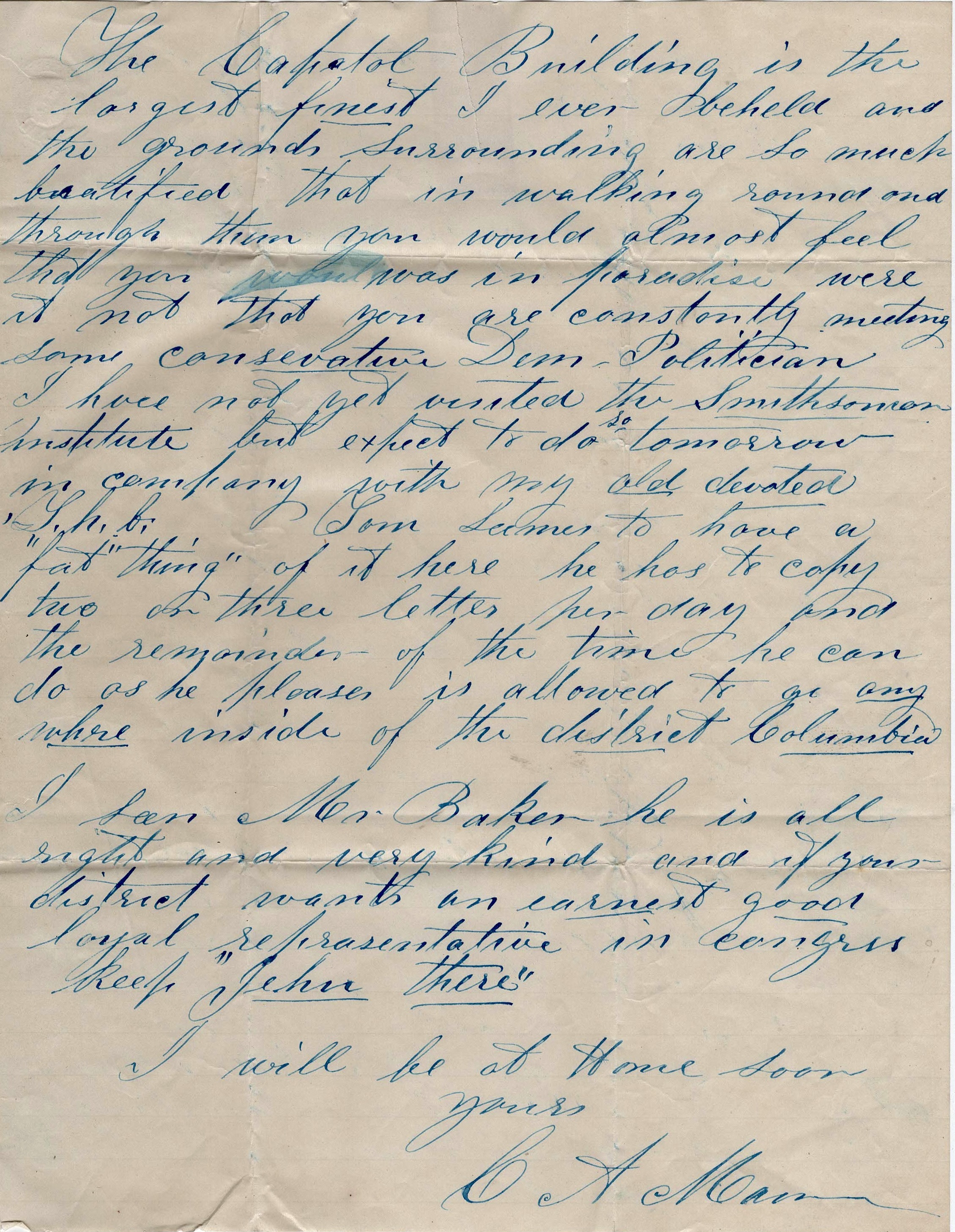 The Capitol Building is the largest, finest I ever beheld and the grounds surrounding are so much beautified that in walking round and through them you would almost feel that you was in paradise were it not that you are constantly meeting some conservative Democratic politician.