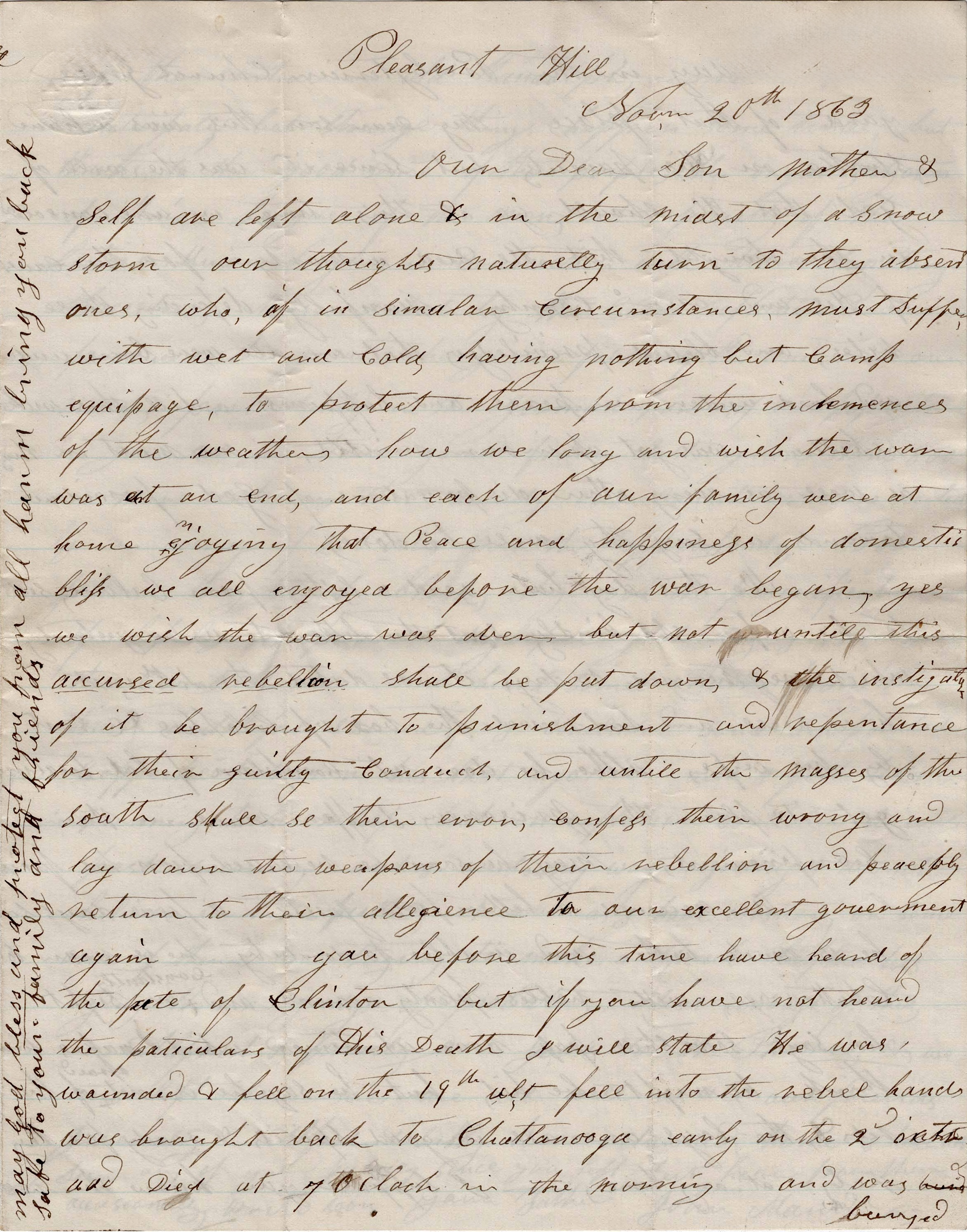 You before this time have heard of the fate of [your brother] Clinton but if you have not heard the particulars of his death, I will state. He was wounded on the 19th ult. [at the Battle of Chickamauga], fell into the rebel hands, was brought back to Chattanooga early on the 2nd October, and died at 7 o’clock in the morning and was buried the same day in the Presbyterian Church grave yard of that place. My dear son, this was a hard stroke on his parents but since it was the will of God that he should go at this time, we are consoled in the thought that he died a martyr for the cause of his and our own country, manfully defending those rights and blessed privileges that we all were born under and lived under in peace and happiness until this wicked rebellion rebellion was got up under our midst. We must in this—as well as every other dispensation of God’s providence towards us—say, “thy will be done.”
