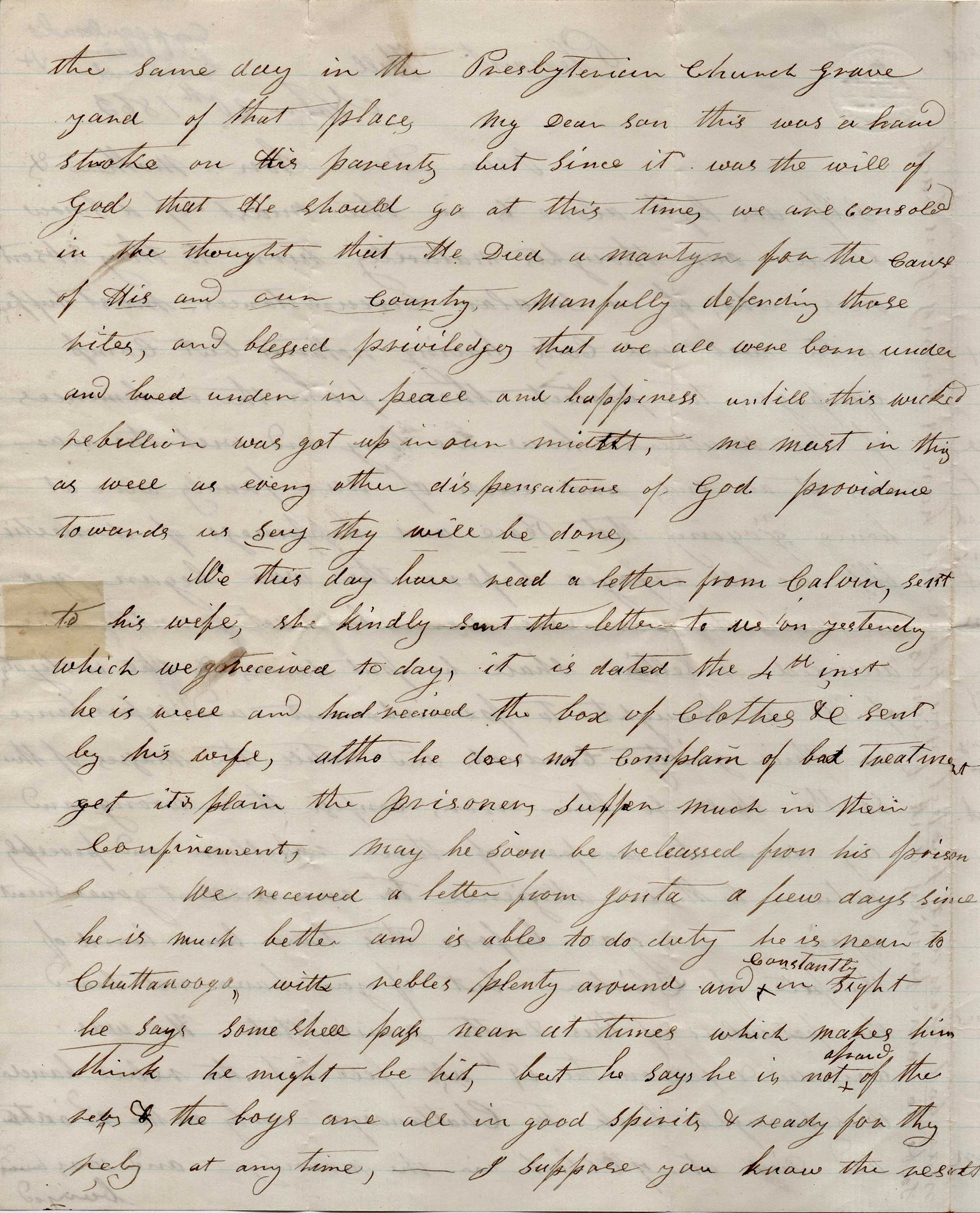 We this day have read a letter from [your brother] Calvin sent to his wife. She kindly sent the letter to us on yesterday which we received today. It is dated the 4th inst. He is well and had received the box of clothes &c. sent by his wife. Although he does not complain of bad treatment [at Libby Prison], yet it’s plain the prisoners suffer much in their confinement. May he soon be released from his prison.