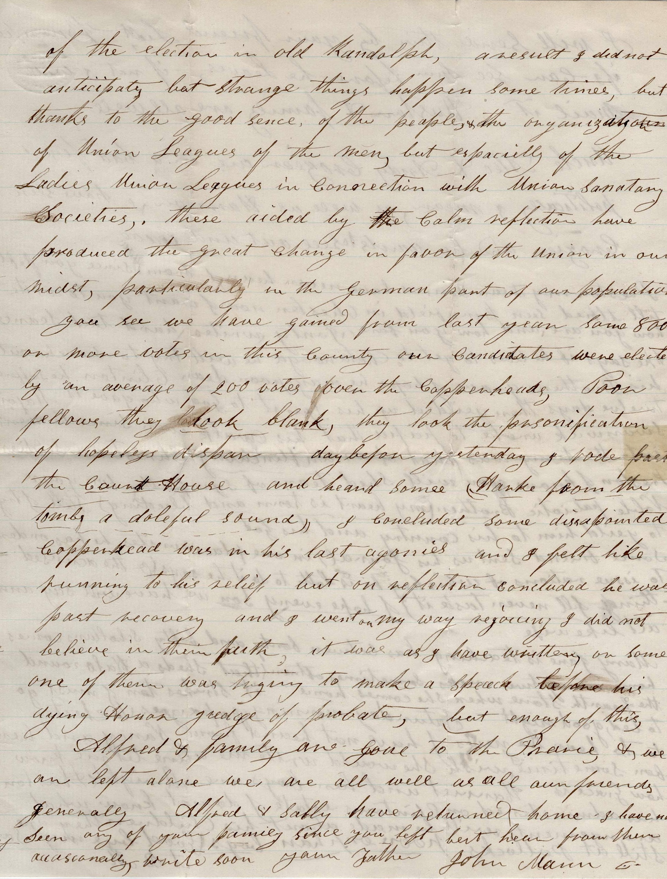 I suppose you know the result of the election in Old Randolph [County]—a result I did not anticipate but strange things happen some times. But thank s to the good sense of the people, the Organization of Union Leagues of the men, but especially of the Ladies Union Leagues in connection wit hthe Union Sanitary Societies, these aided by calm reflection have produced the great change in favor of the Union in our midst, particularly in the German part of the population. You see we have gained from last year some 800 or more votes inn this county, Our candidates were elected by an average of 200 votes over the Copperheads. Poor fellows! They look blank. They took the personification of hopeless despair.