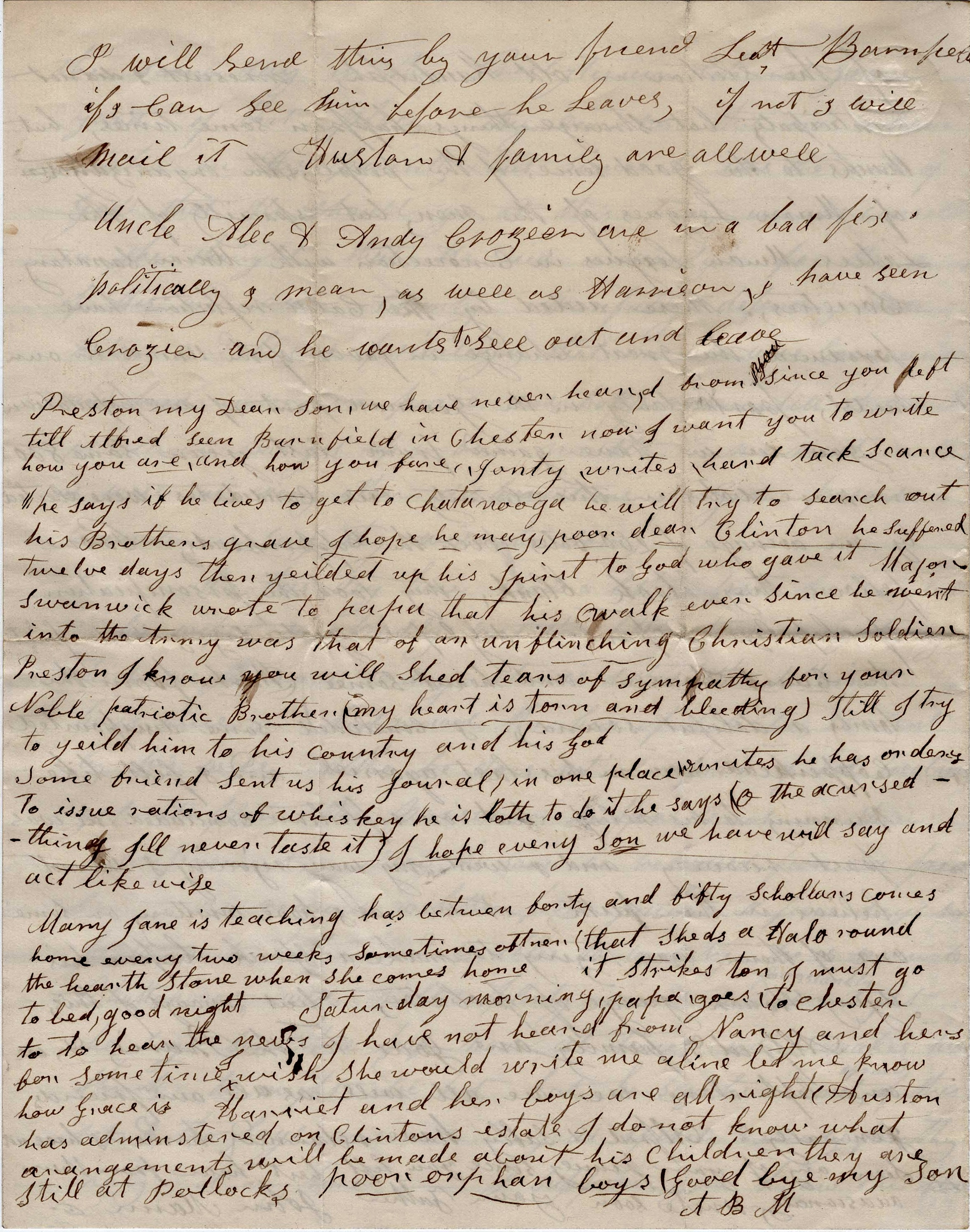 Preston, my dear son, we have never heard from you since you left till Alfred seen Barnfield in Chester. Now I want you to write how you are and how you fare. Junty writes that hard tack is scarce. He says if he lives to get to Chattanooga, he will try to search out his brother’s grave. I hope he may. Poor dear Clinton. He suffered twelve days, then yielded up his spirit to God who gave it. Major [Frank] Swanwick wrote to papa that his walk, ever since he went into the Army, was that of an unflinching Christian soldier. Preston, I know you will shed tears of sympathy for your noble, patriotic brother (my heart is torn and bleeding). Still I try to yield him to his country and his God. Some fried sent us his journal. In one place he writes he has orders to issue rations of whiskey. He is loathe to do it [and] he says, “Oh the accursed thing! I’ll never taste it.” I hope every son we have will say and act likewise.
